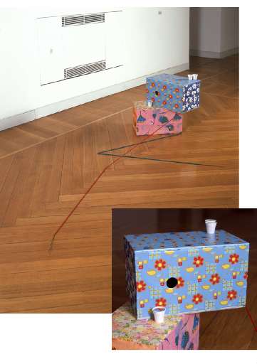 È però con Gli sposi che il messaggio dell’artista trova la sua forma più compiuta; nell’ammassarsi di due scatole disposte una sopra l’altra, nel fragile equilibrio dei bicchieri abbandonati su di esse, nei fili avvolti dalla plastica che si espandono a terra e nei buchi delle scatole stesse, avvolte dalla carta regalo con disegni di Paperino e Winnie The Pooh. Il tono dimesso, accentuato dall’impressione di essere arrivati alla fine di “qualcosa”, fa sì che l’opera appaia quasi perduta nello spazio circostante, consegnando allo spettatore il sentimento di un’incolmabile precarietà, di una disarmonia palese e scomoda, che giustifica però l’urgenza di una rappresentazione ai limiti della drammatizzazione, un passo prima dell’incombere della tragedia.