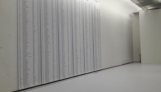 Dal pavimento la cura-Vitone si sposta al trattamento delle pareti, ricoperte con la polvere raccolta in due anni di passaggi. Operazione che oltre ad incrociarsi logicamente coi quattro giganteschi acquerelli a base polvere della serie Imperium (Raüme), evidenzia una forte prerogativa dell’espressività vitoniana: la condivisione dell’opera, la collaborazione/inclusione di “autori esterni” nella sua genesi (non per nulla Lo Pinto racconta «in principio s’era pensato d’intitolare questa mostra “Noi, Luca Vitone”»), quel reciproco “da me a voi” a sua volta specchio-riflesso di una poetica incentrata sulla propensione naturale al racconto. Vitone è story teller di spessore, trasversalmente politico – ma «sono un artista, non sono un militante, non faccio politica» specifica – e immensamente sociale; forse è proprio questa sua innata socialità a far si che le sue narrazioni – quelle che l’art system determina come opere d’arte – scaturiscano da una sorta di “autonomia comune e condivisa” messa in pratica avvalendosi direttamente dell’azione indiretta di tanti suoi simili, nel caso proprio del site specific Stanze (PAC Milano) tutti quelli che hanno prodotto sporco e polvere necessari alla sua creazione. I medesimi che con lui hanno condiviso una delle pagine più aleatorie della storia italiana, raccontata con Souvenir d’Italie (Fondamenti della Seconda Repubblica) nell’enorme lista di iscritti alla loggia massonica P2, o tante altre vicissitudini del Belpaese. In pratica una sintomatologia poetica che si espande a macchia d’olio.