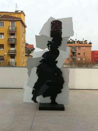 Si ascende al primo livello dove l’epopea del “naso” subisce l’ibridazione donchisciottesca: nasi condottieri, cavalieri impavidi e coraggiosi, dalle fattezze antropomorfe diventano piccole sculture in bronzo o grandi arazzi. Intanto sull’ampia terrazza esterna una serie di lamine di ferro nere e bianche all’apparenza connesse tra di loro senza alcun senso logico si sovrappongono per circa 3 metri e si configurano davanti ai nostri occhi man mano che ci avviciniamo ad essa fino a formare Firewalker, la scultura di una donna sudafricana che porta sulla testa un contenitore con i carboni ardenti, miniatura della stessa realizzata a Joannesburg nel 2009 pressapoco dell’altezza di 20 metri.