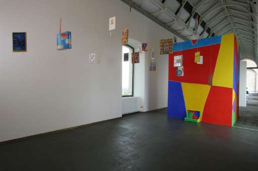 Senza seguire l’itinerario proposto nella Manica lunga, si potrebbe cominciare con la “casa del pensiero” che uno svogliato Nicola De Maria ha montato e colorato. Ma non è tanto questa a turbare, quanto l’“installazione” sul retro: qualche catalogo dell’artista beneventino appeso al soffitto e nulla più. Passando oltre, si troveranno quattro sculture di Enzo Cucchi (ma non era una mostra sui libri d’artista?), i manifesti delle mostre e i libri/cataloghi di Joseph Kosuth, quelli in tavoli “a scomparsa” di Lawrence Weiner e quegli altri nelle teche di Hanne Darboven, al cui allestimento l’artista non ha partecipato.
