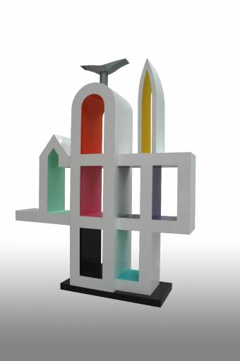 Una marcata linea di contorno e colori vibranti sono la sigla di questi “oggetti” d’arredamento, realizzati tassativamente in serie limitata (esclusi i tappeti) e con titoli ispirati alla West Coast. San Francisco è una libreria pensata anche come parete divisoria ed evoca lo skiline della città californiana. Il monolitico cilindro Los Angeles è un contenitore bar che, con le ante aperte, acquista una certa leggerezza. Gambe sinuose e un ripiano in cristallo, dove l’artista ha tracciato parole e disegni, caratterizzano il tavolo Golden Gate. Venice è un trumeau con una morbida silhouette che ricorda le onde del mare.