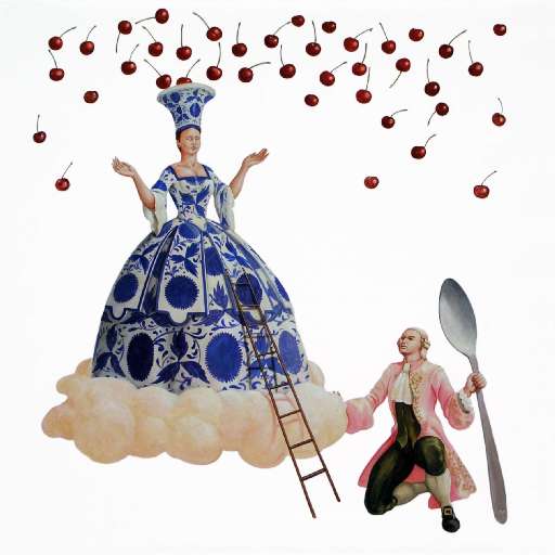 Una sottile e a volte pungente ironia pervade le opere di Vanni Cuoghi, che immagina una “dea dei frutti” dal cui capo sgorgano amarene, o di Andrea Salvatori, con un drago goloso che si avventa con furia sul vaso pieno di sciroppo, o ancora in quella di Giuseppe Rado, che gioca a nascondino con il concetto di specchio e di altro da sé.