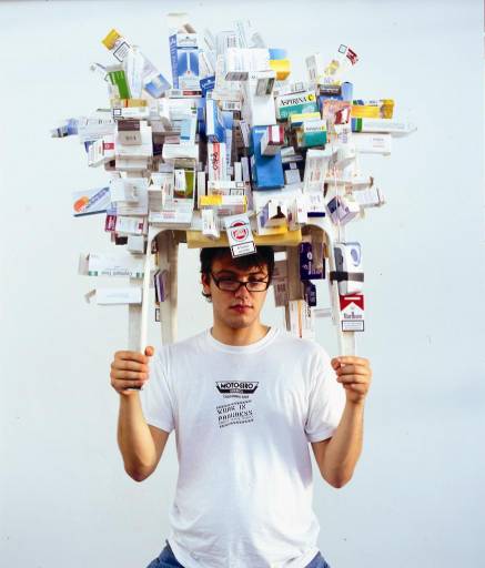 La differenza fondamentale viene individuata nello scopo di queste trasformazioni: le une operate per necessità, per bisogno e utilità pratica, le altre generate per offrire una percezione diversa del reale quotidiano. Appartengono a quest’ultima compagine tanto gli assemblaggi di goniometri, scalimetri, curvilinee costruiti da Dafne Boggeri come déjà-vu dei test di Rorschach, quanto il design di recupero di Flavio Favelli, figlio di una passione per il passato, per l’effetto vintage, perfettamente inserito in una poetica del patchwork di età e di stili.
