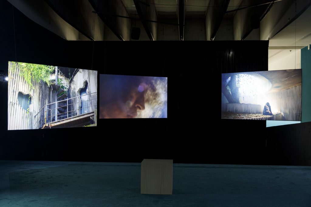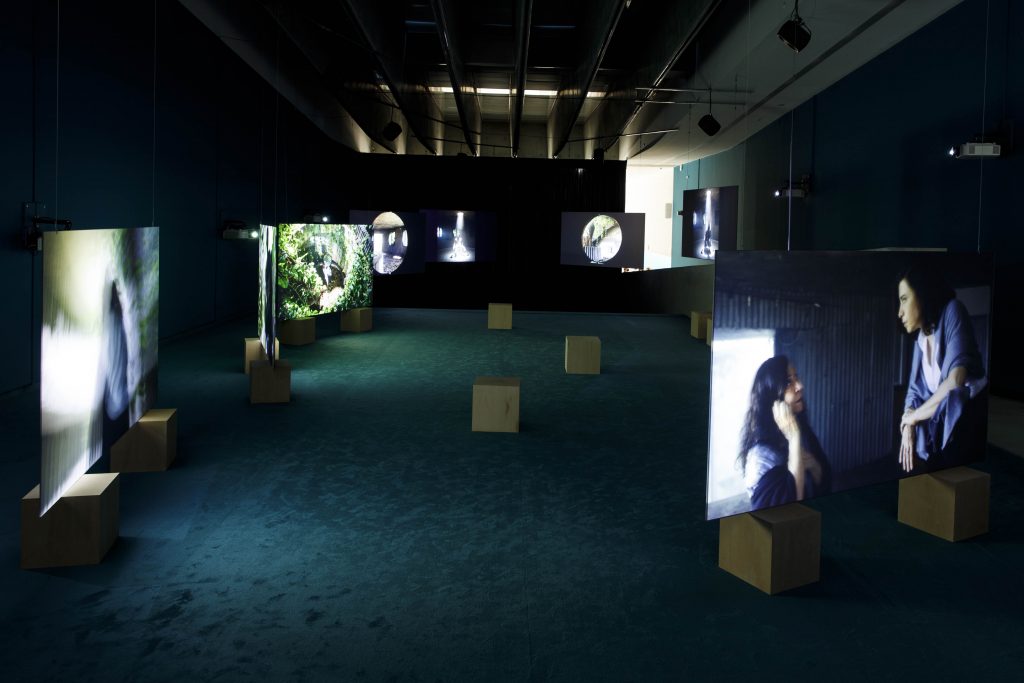 Esposta precedentemente presso la sede londinese della galleria Victoria Miro, la monumentale installazione di Isaac ridisegna completamente la sala della Fondazione, donando un inedito dinamismo allo spazio. Delimitata da due teatrali sipari scuri, la Galleria 3 si trasforma in un palcoscenico su prendono vita i nove schermi sospesi. La mitologica Lina viene raccontata in un film a più livelli con immagini coreografate alternativamente e simultaneamente. Proprio come “un meraviglioso groviglio”, la pellicola si rifà a una concezione ciclica del tempo in cui ogni cosa è armoniosamente interconnessa. La ritmicità dei movimenti e la drammaticità dei suoni si fanno prepotentemente spazio all’interno della narrazione, diventando la struttura portante del linguaggio espressivo. Le attrici brasiliane Fernanda Montenegro e Fernanda Torres, madre e figlia nella realtà, interpretano rispettivamente una Lina matura e una più giovane, offrendoci uno sguardo intimo dell’architetta grazie alla rilettura di alcuni dei suoi scritti che ci parlano di libertà collettiva e della poetica essenzialmente rigorosa dell’architettura. È di poesia che si fa portavoce anche la pratica di Julien, narratore mosso dall’urgenza espressiva di un linguaggio poetico veicolato dal video.