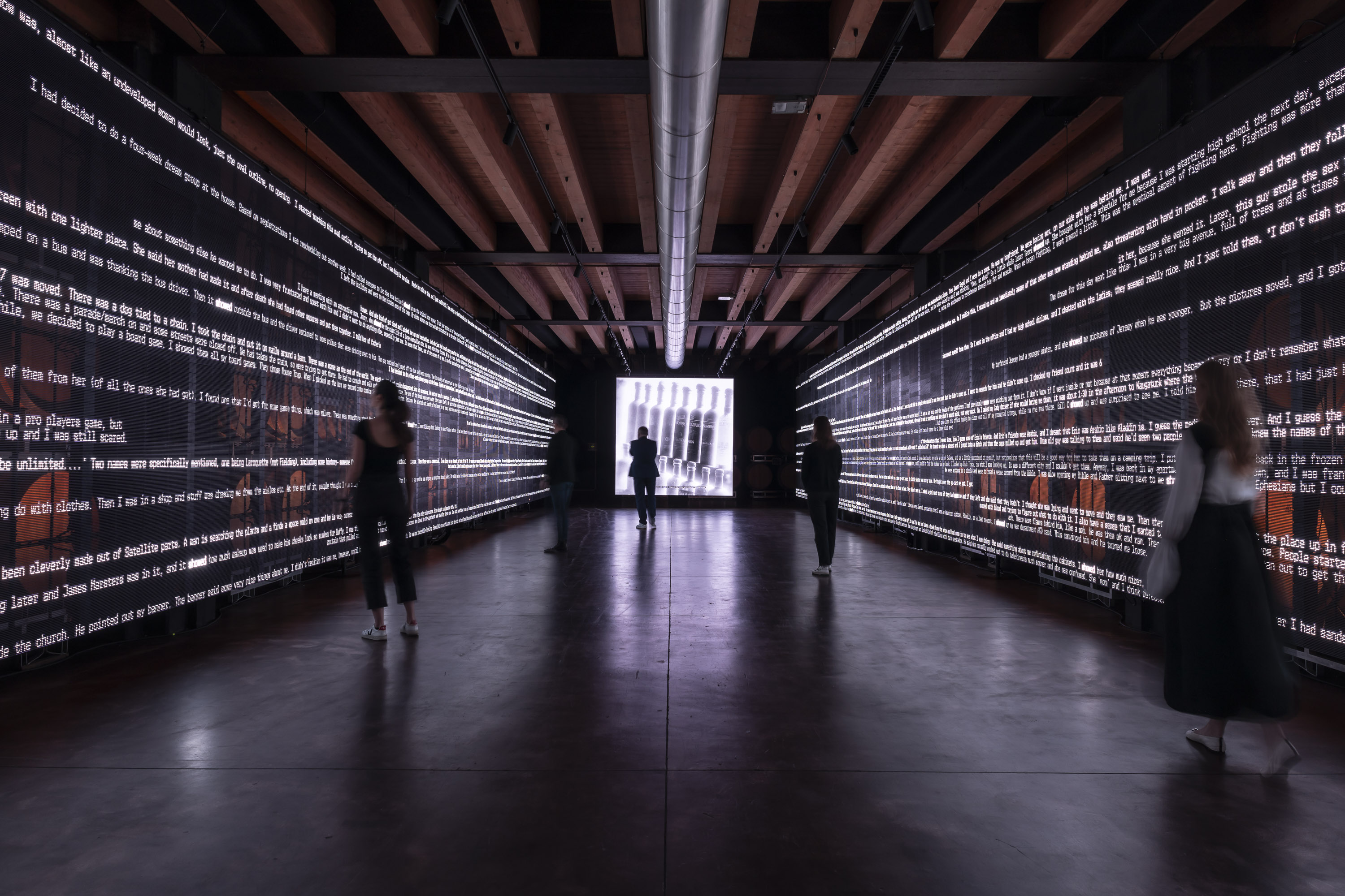 Il cinema viene definito la macchina dei sogni ed è per questo motivo che fuse* punta a proporre un’esperienza dal gusto cinematografico. Dei 28.748 sogni, ne sono stati selezionati 30 dall’archivio del Laboratorio di Psicofisiologia del sonno e del sogno dell’università di Bologna. Questi 30 sogni si susseguono nello schermo centrale mentre, lateralmente, ogniqualvolta vengono nominate delle parole, queste ultime appaiono evidenziate sui pannelli led trasparenti adagiati davanti alle botti. Come mai? Parole come “crocodiles”, “sea”, “ship”, “bear” sono infatti state estrapolate da tantissimi sogni, raccolti come testimonianze oniriche nel data-set californiano. Si crea così una connessione tra persone diverse provenienti da contesti altrettanto eterogenei che tuttavia sembrano condividere paure, desideri, pulsioni a livello inconscio.