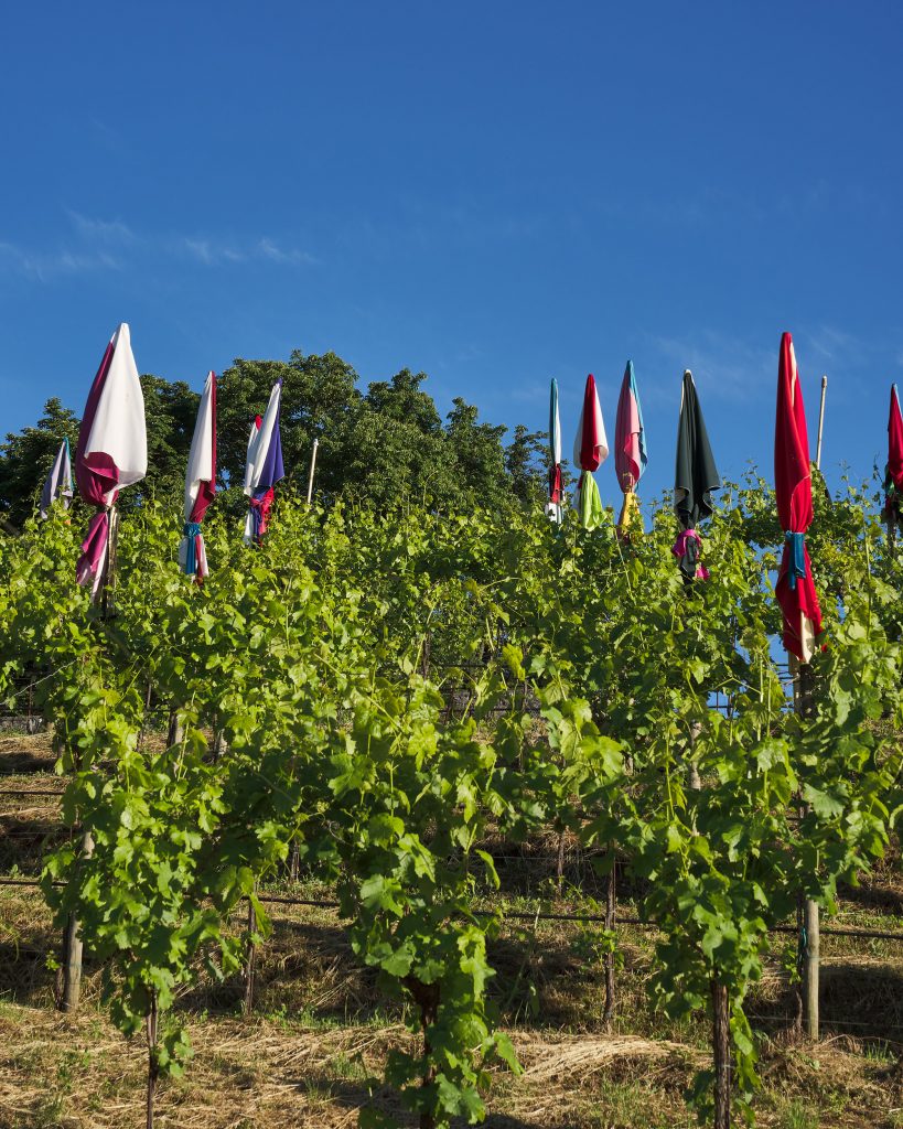 L’installazione dalle distese dimensioni, visibile fino al 21 ottobre 2021, consiste in una successione di centinaia – saranno circa 600 – di ombrelloni da spiaggia colorati, piantati all’aperto tra i filari della vigna urbana, riconosciuta come la più grande d’Europa con i suoi quattro ettari e divenuta Vigneto Pusterla di Monte Rossa, nonché cantina storica del Franciacorta guidata da Emanuele Rabotti. «Mi piace pensare che LA PLAGE di Tayou, uno degli artisti africani più noti al mondo con numerose esposizioni internazionali e biennali d’arte, sia l’apripista della nostra missione 2023, quando Brescia insieme a Bergamo saranno Capitali Italiane della Cultura», ha spiegato Rabotti.