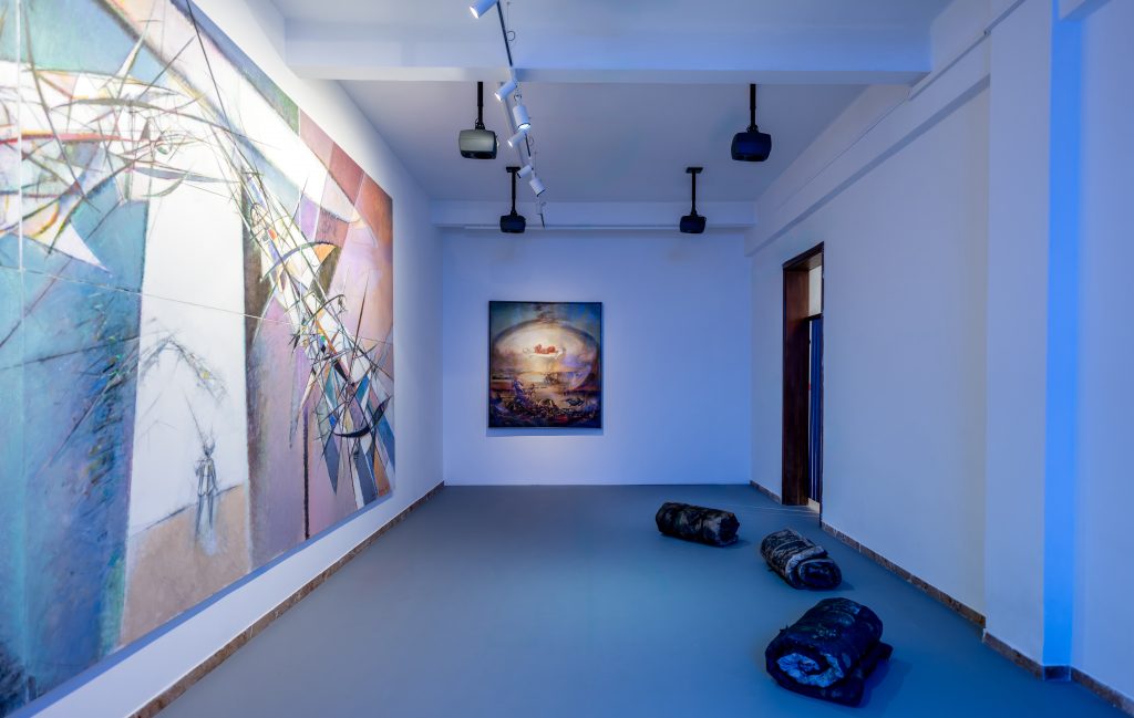 Nella prima sezione, Danagul Tolepbay, figura chiave dell’arte contemporanea kazaka, presenta due dipinti significativi che incarnano la tensione tra speranza e distruzione in un contesto apocalittico. New Child. Rebirth, 2023-2024, raffigura un bambino come simbolo di salvezza, reinterpretando in chiave michelangiolesca il tema della redenzione. In dialogo con le sue opere troviamo l’installazione sonora Presence, 2024 di the2vvo, duo artistico composto da Eldar Tagi e Lena Pozdnyakova, che va crea un’esperienza immersiva attraverso un ologramma sonoro basato sugli archivi di suoni tipici della tradizione centro-asiatica.