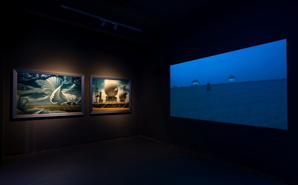 Nella sezione successiva, l’arte di Sergey Maslov e Yerbolat Tolepbay si distingue per l’audace esplorazione della connessione tra l’umanità e il cosmo. Sergey Maslov, pioniere della fotografia digitale come forma artistica, ha sfidato i confini della percezione visiva combinando la yurta kazaka con immagini di astronavi e extraterrestri. In Baikonur-2, emerge la sua visione provocatoria del futuro esplora la possibilità di una coabitazione tra umani e altre specie aliene, riflettendo sulle implicazioni culturali e cosmiche di un’interazione interplanetaria. Mentre in Six Lives of One Soul, The End of the Beginning and the Beginning of the End, Mobile Unit, Saken Narynov propone un progetto di sinergia abitativa fra tradizione kazaka e vita-interplanetaria, in cui si immagina delle strutture abitative singole, che richiamano per la struttura architettonica alla tradizione kazaka, pronte ad staccarsi dall’albero maestro per viaggiare nello spazio.