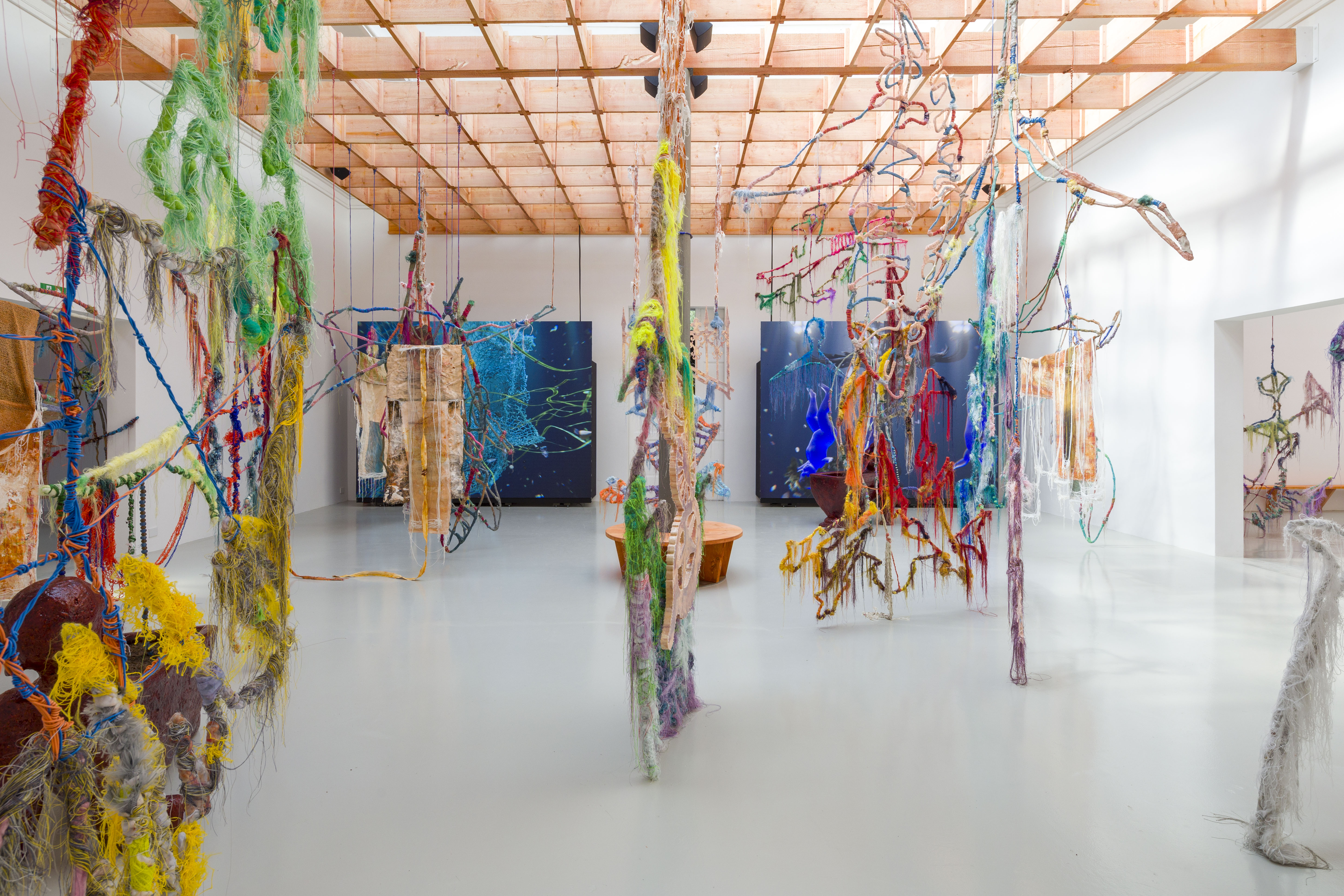 Il Padiglione Francia di Julien Creuzet sembra una festa glam e non a caso Chanel Culture Fund è lo sponsor principale del progetto, curato da Céline Kopp e Cindy Sissokho. Ci si aggira tra 80 sculture di sei tipi diversi, esili presenze fantasmatiche e residuali di tessuti sfilacciati, resine e altri materiali non esplicitati per non intaccarne il mistero, quasi tutte in sospensione dal soffitto come se stessero spiccando un salto durante una danza dai colori accesissimi. Sulle pareti, sei videoproiezioni di creature provenienti da una biologia onirica più che mitologica. Nell’atmosfera, una serie di composizioni sonore ad alto impatto ritmico, appositamente pensate per l’installazione. «Ciò che voglio offrire ai visitatori di questo Padiglione è una zona di confluenza complessa e sensoriale, un’esperienza profondamente vissuta. Per me questo è lo scopo di questo spazio. È un crocevia, un luogo dove tutto può essere incontrato, soprattutto se stessi», dice l’artista classe 1986 e di origini franco-caraibiche. Già il titolo del progetto, che come sempre nei lavori di Creuzet ha la forma di una poesia, ci introduce a una molteplicità di sensazioni non sempre esprimibili: Attila cataracte ta source aux pieds des pitons verts finira dans la grande mer gouffre bleu nous nous noyâmes dans les larmes marées de la lune.