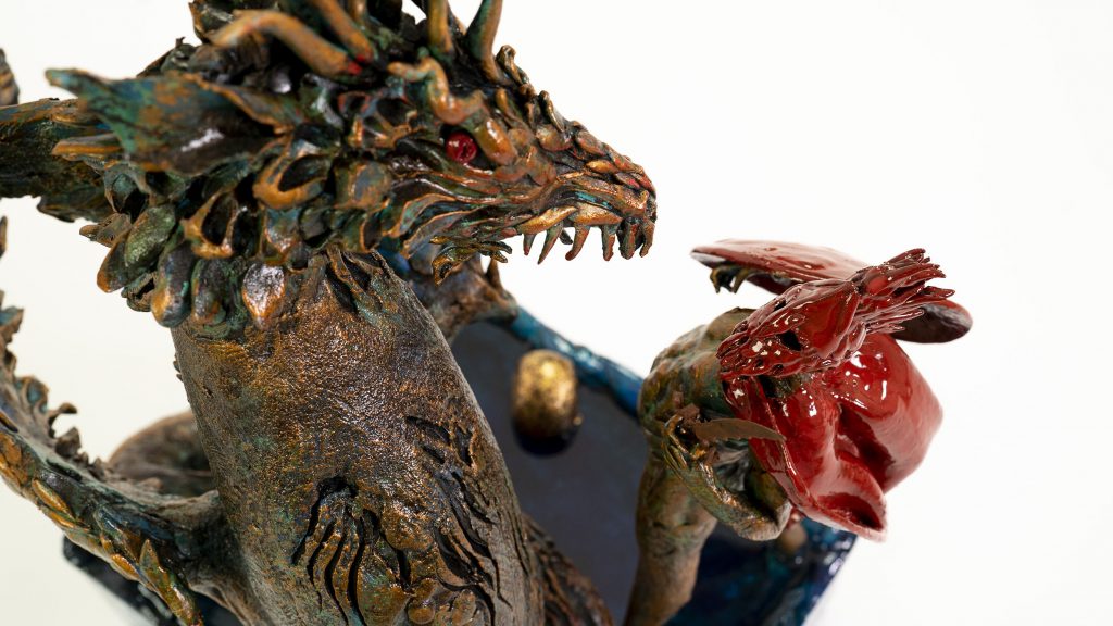 Carlo Zoli, che dal 1985 al 2019 annovera una lunga carriera coronata da mostre personali e collettive in Italia e all’estero, dopo una pausa di riflessione – tra assiduo lavoro e ricerca – è tornato ad esporre le sue creazioni ceramiche ispirate a mito e leggenda; da un lato figure incantevoli, aggraziate e pure, simbolo di vitalità, serenità e armonia, la serie Quiete, dall’altro soggetti d’azione, viscerali e battaglieri, la serie Tempesta, a cui da ultimo si sono aggiunte nuove immaginifiche visioni plasmate nell’argilla, poi terracotta policroma arricchita come sempre da patine cangianti, metalli preziosi, smalti, ma anche da nuovi esperimenti tecnici con l’utilizzo di materiali come i gessi e le resine.
