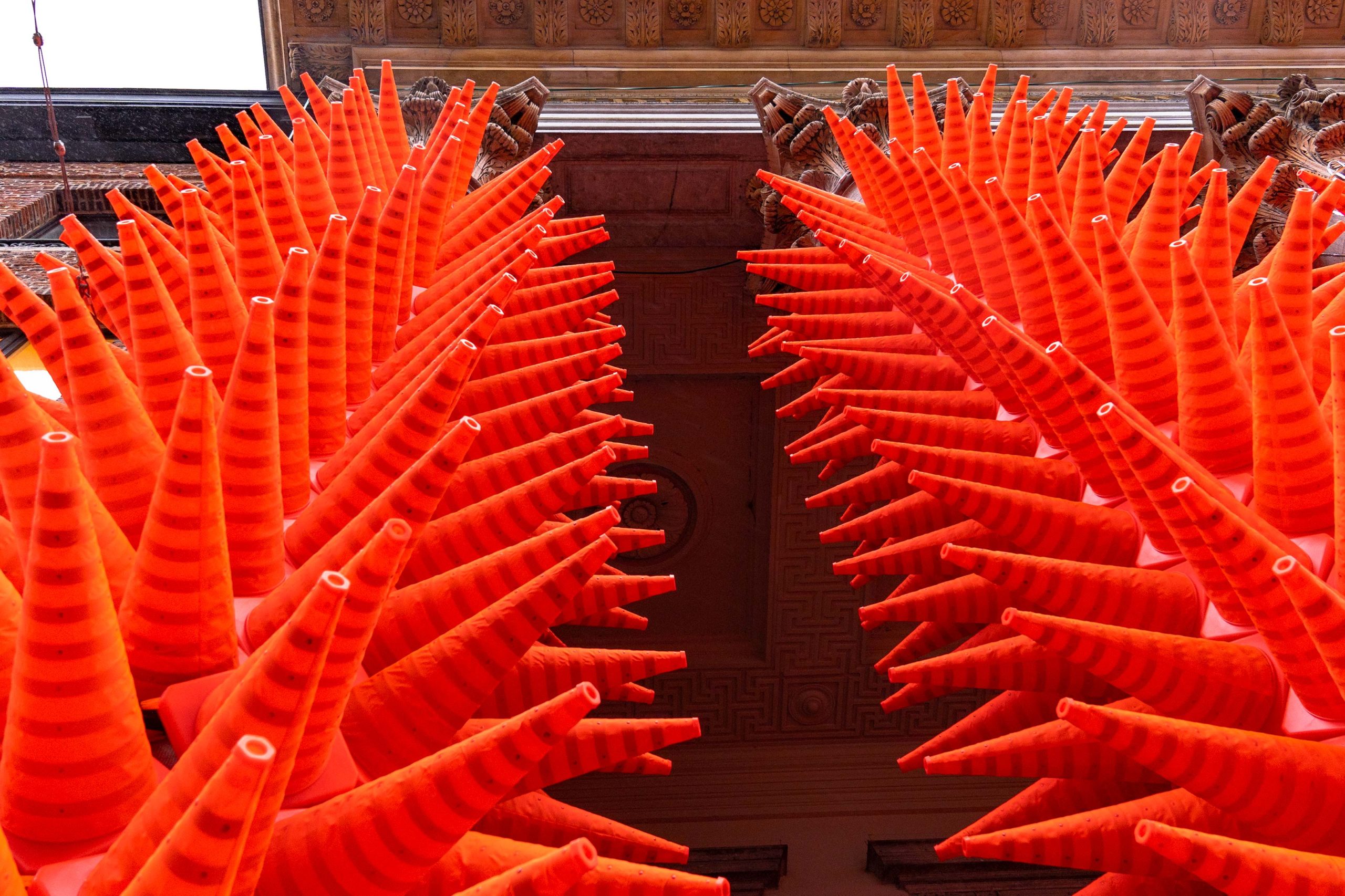 «L’intervento altera la presunta solennità dell’edificio attraverso una rivisitazione estetica non convenzionale e fortemente sovversiva della sua facciata», spiega l’artista. «Partendo dall’appropriazione di un elemento urbano quotidiano, l’opera prende il controllo dell’edificio per creare incontri inaspettati e invadenti, ma allo stesso tempo giocosi, per gli spettatori. Durante la notte i coni si illuminano, aggiungendo uno strato di trasformazione all’esperienza dello spazio stradale».