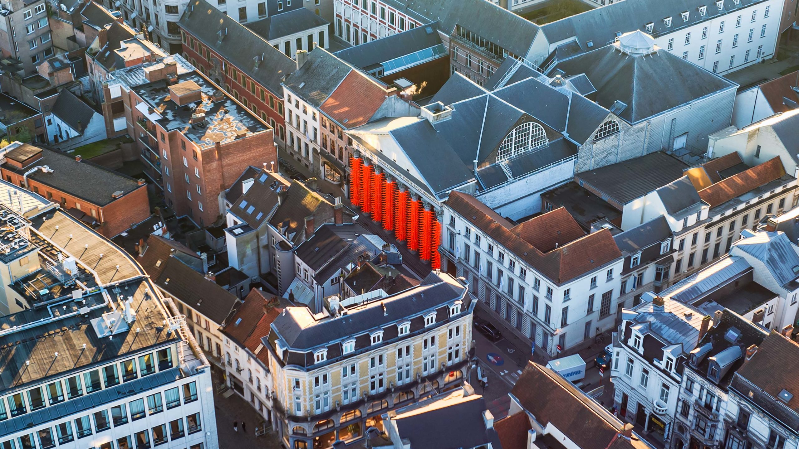 Meraviglia degli oggetti quotidiani più impensabili: come può un umile conetto stradale diventare un’opera d’arte? Chiedere a SpY che, perla sua ultima, spettacolare installazione, ha trasformato la facciata neoclassica dell’Aula Academica dell’Università di Gand, in Belgio, in un fittissimo bosco di spine arancioni riflettenti, che un po’ ripulsa e un po’ attrae.