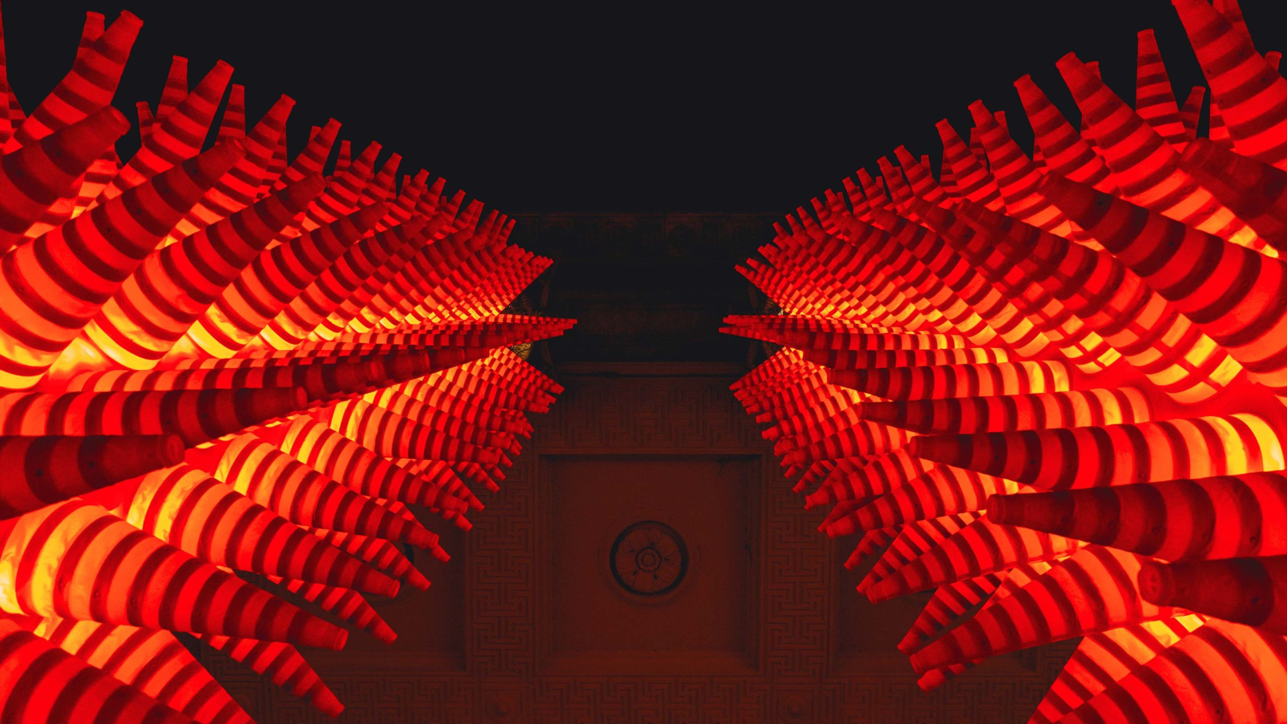 L’opera presentata a Gand si chiama Cones ed è composta appunto da centinaia di coni arancioni che avvolgono completamente le otto colonne della facciata dell’Università. Disposti in questo modo quasi non sembrano più dei coni stradali ma, in effetti, lo sono, quindi sono fatti di un materiale che di notte reagisce alla luce, proiettando un allegro bagliore arancione sull’area circostante.