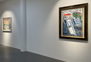 C’è la ricerca della bellezza, senz’altro, nell’inconscio di Giorgio de Chirico, autore della tela Ettore e Andromaca (1955). Ma c’è bellezza anche nei futuristi, presenti in mostra con gli inediti dipinti di Giacomo Balla (Marvele, 1919 ca.) e Fortunato Depero (Personaggi capresi, 1917 ca.), pur essendo ricercata unicamente nella velocità. Come pure si può individuare nella Composition-étude pour une peinture murale (1938) di Fernand Léger. Marc Chagall, dal canto suo, inseguì la bellezza del sogno, la sua purezza. È nella dimensione del sogno, infatti, che questo artista raggiunse la “vera” bellezza, che è insieme soprannaturale, magica, miracolosa, come testimonia il suo suggestivo dipinto in mostra Les Mariés sur fond bleu (1980-82).