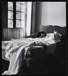 Nella mostra bolognese è possibile vedere una delle serie più celebri (e raramente fruibili) di Kati Horna, Oda a la necrofilia, originariamente commissionata dalla rivista d’avanguardia S.Nob, i cui scatti originali provengono dall’archivio della figlia Nora. Come in una pièce teatrale, queste fotografie in bianco e nero svelano la storia di una donna, interpretata da Leonora Carrington, coperta da un velo nero, che incarna l’idea del lutto. Una finta maschera bianca messicana giace su un letto vuoto e disfatto mentre una candela accesa fa da contraltare all’assenza del defunto. Presto però la tristezza si trasforma in desiderio: la donna si accende una sigaretta, apre un ombrello nero che ricorda i quadri di Renè Magritte, si specchia e si spoglia fino a rimanere nuda, di schiena. La sottigliezza della narrazione svelata nei particolari e la perfezione della composizione ci confrontano con una artigiana della fotografia dall’istinto per l’istante perfetto. In mostra è inoltre possibile vedere una foto tratta dalla serie satirica Hitlerei del 1937, dove l’autrice politicamente impegnata ritrae le disavventure del dittatore trasformato in un uovo alla coque.
