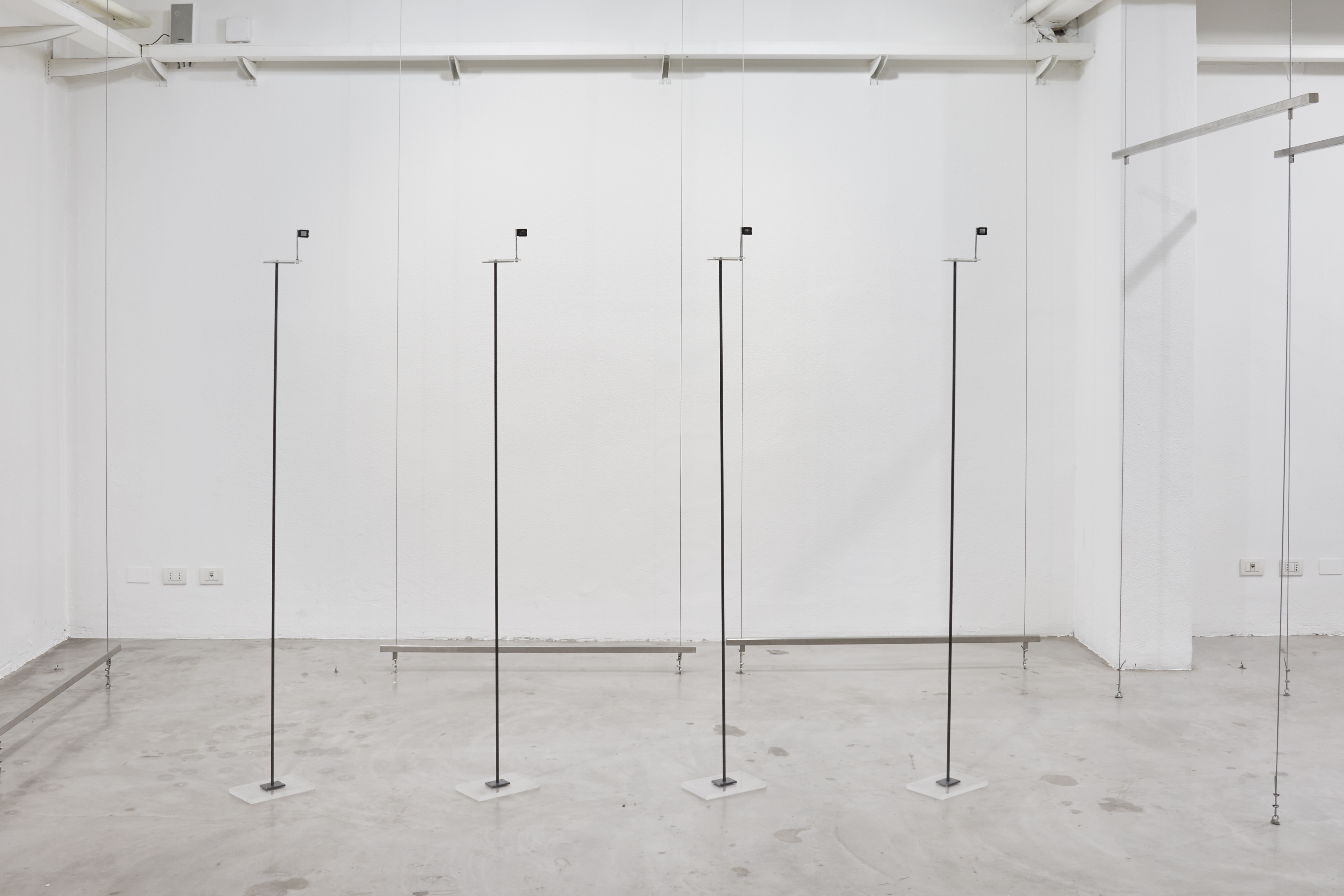 Yara Piras, in Sbandierare ai quattro venti (4), gioca con quattro diapositive posizionate su altrettanti pali, riuscendo a dare una forma rigorosa e quasi statica al vento della tempesta. Le immagini scelte sono frame video censurati durante il fascismo e riportati alla luce dai recenti studi archivistici. Lo spettatore, nella dinamica dell’installazione, è tuttavia obbligato ad alzare lo sguardo, quasi come in un gesto di riverenza, per vedere le diapositive, posizionate come bandiere su quattro lunghe aste. I vessilli, portatori di messaggi ignorati al loro tempo, svettano ora severi, riacquistando la dignità che gli era stata privata.