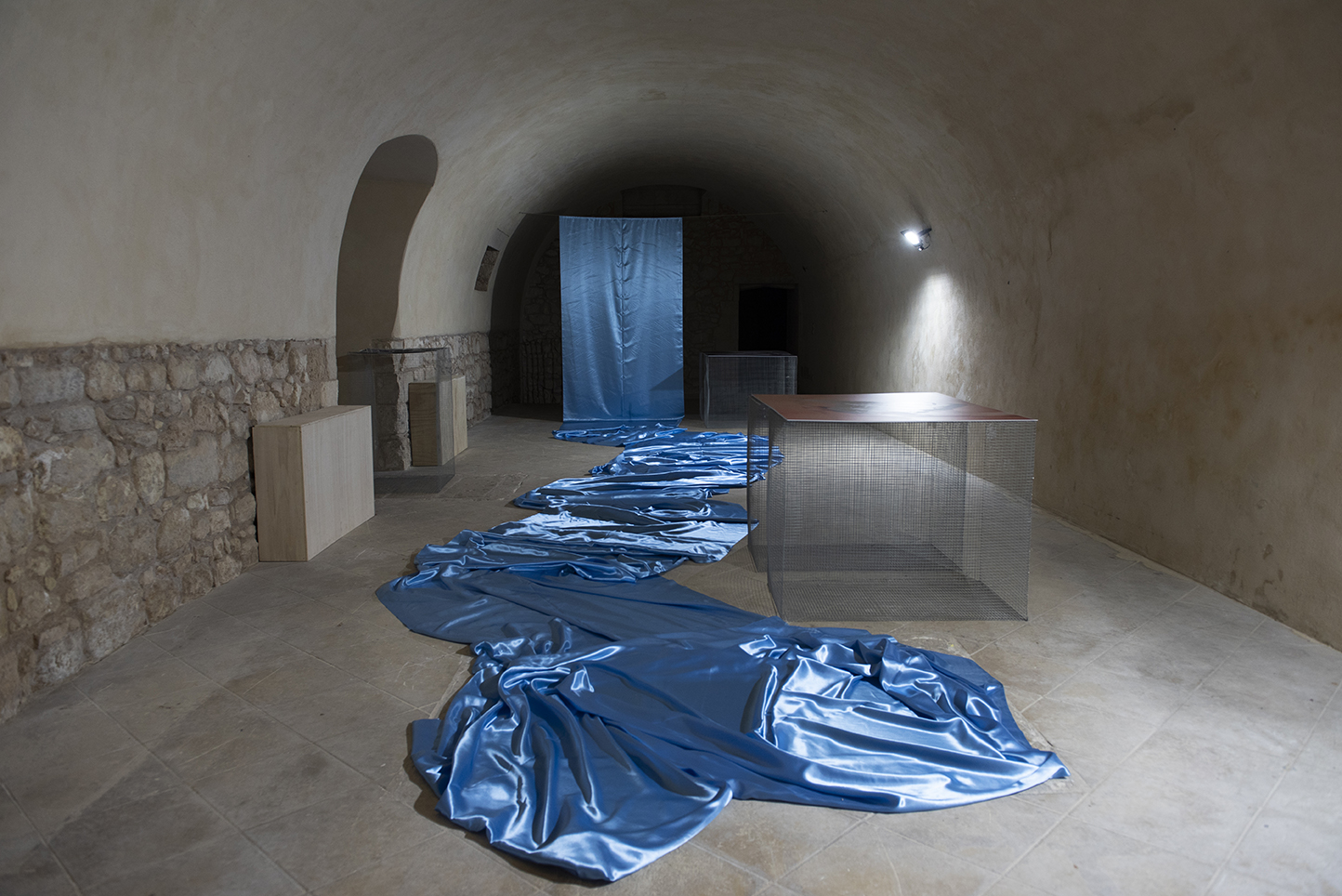 Partita da una performance realizzata nell’ottobre 2022 nel parco delle pozzelle di Castrignano, luogo singolare, in cui acqua e terra si incontrano in un paesaggio immaginifico, l’installazione combina oggetti, immagini e fonti d’archivio, con materiali scenici, il più importante dei quali è un lungo drappo azzurro. Si determina così un cortocircuito visivo in cui il vero infonde nel finto e ciò che non è diviene più attendibile e rassicurante di ciò che è. Un panorama umano è invece quello che si delinea nell’opera acustica Scarcagnuli di Riccardo Giacconi e Carolina Valencia Caicedo. Nel racconto di storie personali s’intrecciano esperienze, riti collettivi e folklore, componendo un inusuale e inaspettato dipinto acustico del Capo di Leuca, luogo in cui la terra finisce e inizia il mare, in cui il localistico si apre all’universale.