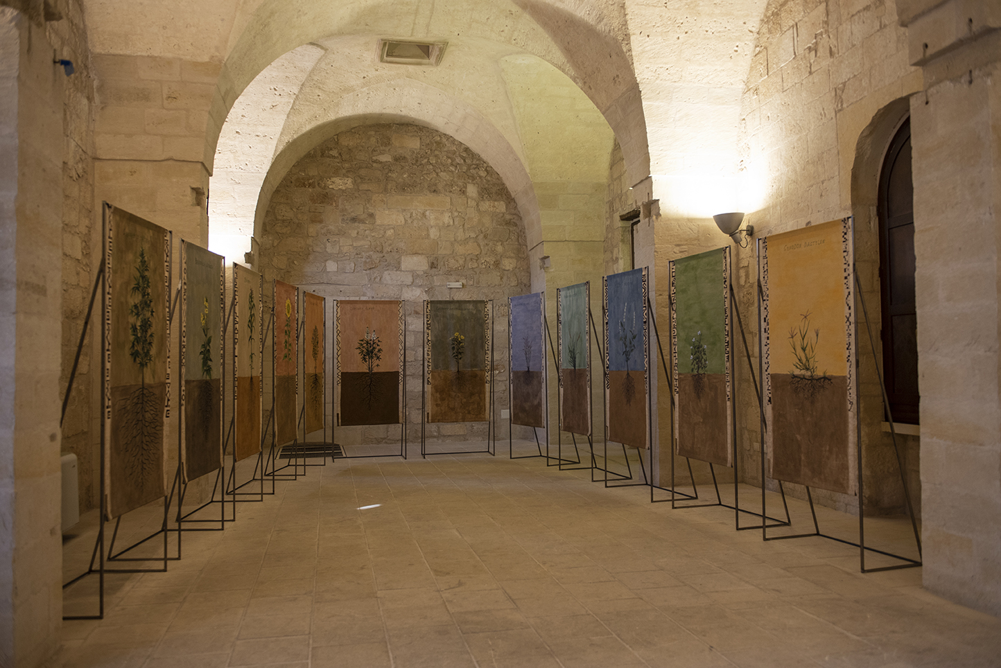 La proposta espositiva di Kora si completa con la mostra di Luigi Coppola, Riarborescenze: prove per un pianeta che attende di germinare, a cura di Lucrezia Cippitelli, Paolo Mele e Claudio Zecchi. Una mostra bicefala, con un intervento indoor, Ex Situ, vincitore della decima edizione dell’Italian Council. L’installazione, realizzata nella Repubblica Democratica del Congo, è composta da 12 arazzi in cui sono rappresentate altrettante piante note per le loro proprietà fitorimediative. Attraverso queste si avvia una riflessione sullo sfruttamento del territorio in età coloniale e post coloniale aprendo la via ad un futuro differente, di rigenerazione. Lo stesso tema anima l’intervento outdoor, Vinculum, sparso nelle via di Castrignano, in cui la rappresentazione degli ulivi rimanda al dramma della Xylella e all’impellente necessità di ristabilire con la terra un rapporto più coscienzioso e armonico.