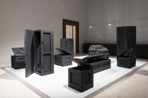 A Milano, alla Fondazione Marconi è in corso la mostra “Out Of Order”, dedicata ai collages Louise Nevelson, a Venezia la scultrice ucraina nata nel 1899 e scomparsa nel 1988, naturalizzata statunitense, presenta il il potente assemblage Homage to the Huniverse (1968) all’Arsenale in occasione della 59° Biennale a cura di Cecilia Alemanni, ispirato all’Espressionismo astratto e all’attrazione del Color Field per le vaste campiture di colore, con uno strato uniforme di vernice nera opaca, frequente nelle sue opere.