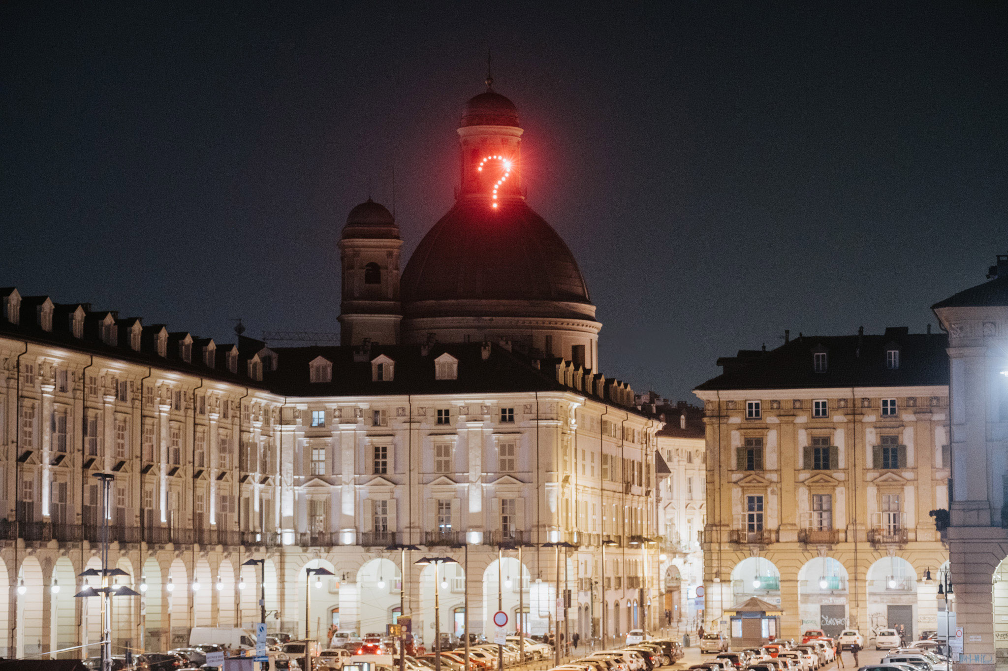 Visibile in piazza della Repubblica, sulla Cupola della Basilica Mauriziana si eleva un grande punto interrogativo “…?…”, segno comprensibile in ogni lingua, animato da una luce scintillante. È l’opera di Grazia Toderi realizzata grazie al contributo di Il Mercato Centrale Torino. Non è un interrogativo immobile, ma si rinnova a ogni sguardo. Rivolta verso la piazza e il mercato, verso la città e ognuno di noi, si staglia nella notte invitandoci a mantenere un “dubbio luminoso”.