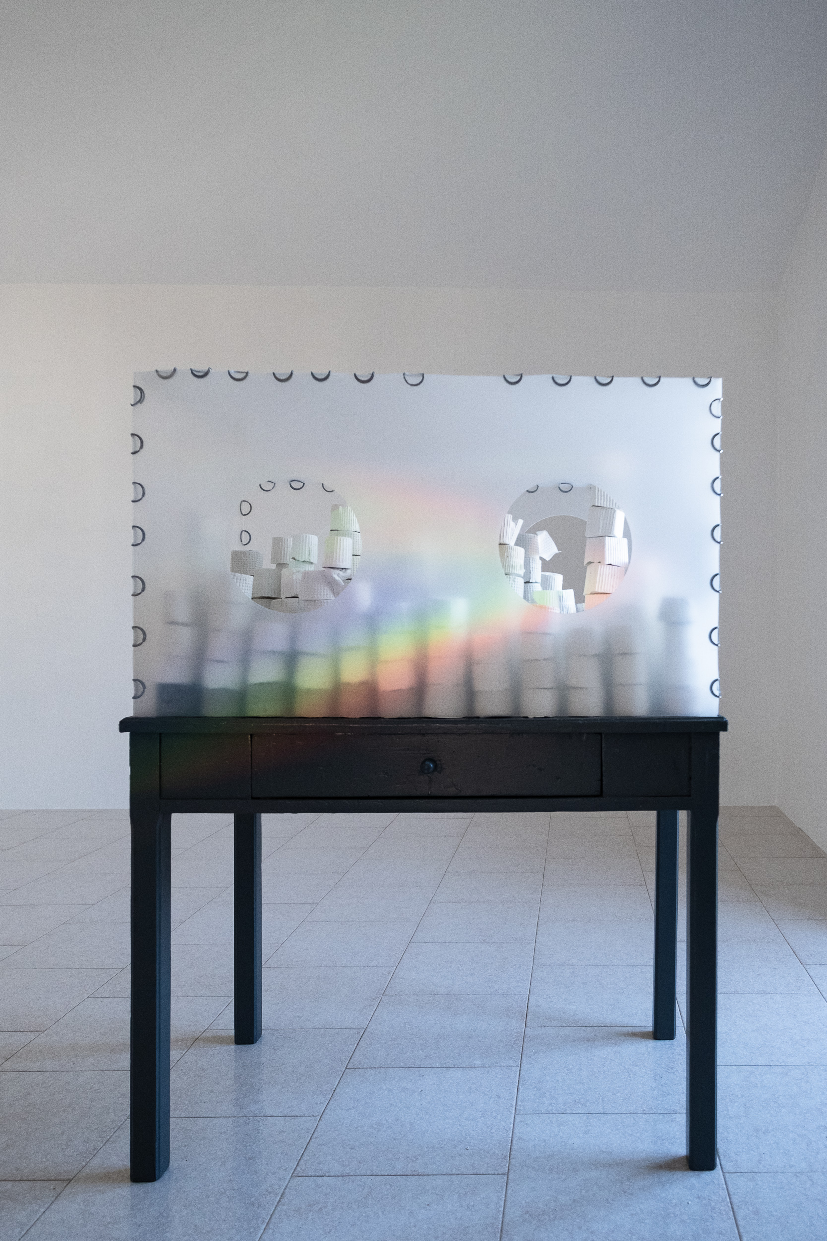 De Cunto – noto anche con lo pseudonimo Faffiffio – presenta sei opere: tre sculture, un’installazione e due disegni, che invitano lo spettatore a mantenere il suo “gioco”. L’approccio ludico dell’artista, però, non deve trarre in inganno, perché le sue creazioni si sviluppano da una base concettuale di grande rilievo.