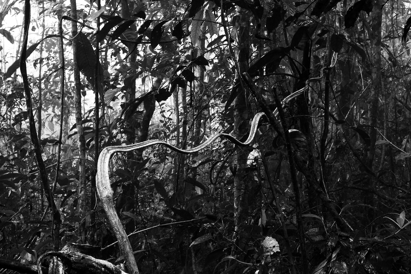 Stranger Things non è poi così strano. Il formidabile, spaventoso e inconoscibile mondo sottosopra, raccontato dalla popolarissima serie tv in onda su Netflix e abitato da famelici e ostili esseri alieni, tutto sommato, non è poi così distante, alieno appunto, dal nostro, ugualmente misterioso, denso, ramificato. Anche qui, vicino a noi, ogni cosa riconduce a un’altra e poi a un’altra ancora e continuando a seguire questo filo di associazioni, non senza qualche brivido, si potrebbe arrivare agli antipodi, in una giungla tropicale e scoprirla affine eppure, allo stesso modo, completamente altra, un “Paradiso nel nuovo mondo”. Giustapposte in un dialogo seducente e straniante, realizzate in momenti e contesti diversi, le due serie fotografiche in bianco e nero di Sergio Vega in mostra alla Galleria Umberto Di Marino di Napoli ci suggeriscono la possibilità non tanto di immaginare quanto di presentire un altro mondo, in continuità con quello abitato, già vissuto e da vivere e raccontare. Da una parte, un archivio visivo di scorci virtualmente infinito, in cui ogni frammento si ribalta nell’altro – un ramo secco e contorto che si staglia nel cielo e alcune strisce di battistrada distese sull’asfalto, un palazzo di edilizia popolare e una distesa di fusti di latta – seguendo associazioni formali evidenti ma anche piccoli segreti, particolari indefinibili ma percettibili, anche se solo in qualche sottile parte della nostra coscienza. E poi, una serie di “primi piani” immersivi e sempre più intricati della Foresta Amazzonica, in cui la presenza dell’uomo, che porta la testimonianza dell’albero caduto, della liana annodata, è una sfida all’immaginazione o al ricordo, un’ipotesi progettuale o l’incipit di un romanzo di avventure. Abbiamo raggiunto l’artista per farci raccontare di più.