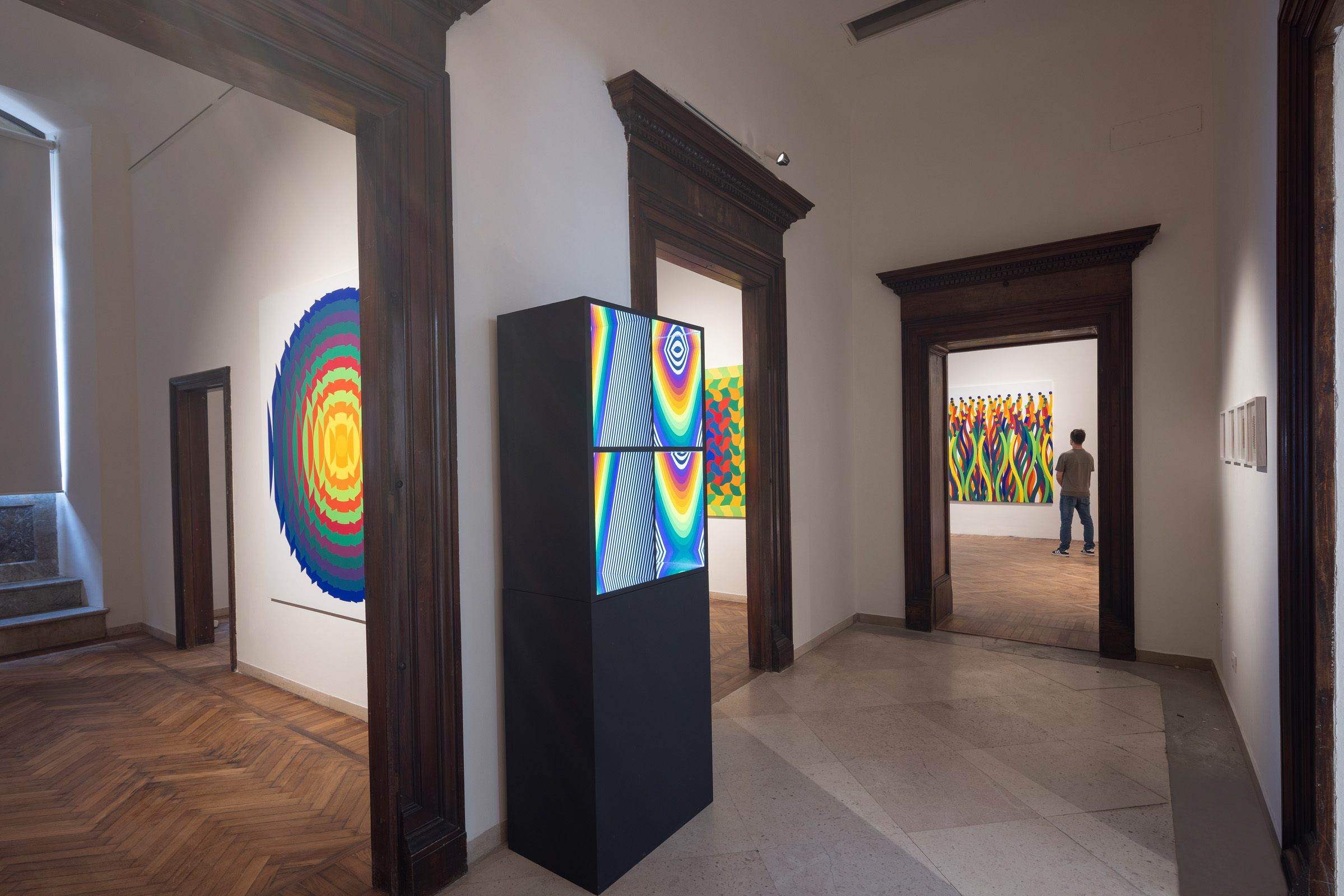 La ricerca cromatica di Julio Le Parc si articola in uno spettro di 14 colori, impiegati con vivacità geometrica nei suoi dipinti, come fossero frammenti di arcobaleno in movimento. Opere come Ondes 139 série 47 n. 8 (1974) e Ondes Alternées à partir d’un thème de 1972 (1972-2018) si diffondono negli spazi del Palazzo delle Papesse con variazioni cromatiche dinamiche, in cui i colori sembrano oltrepassare la tela. La curatrice Marcella Beccaria descrive l’esperienza visiva come un «Accesso a un universo gioioso», dove l’osservatore è invitato a giocare con la percezione e la distanza, come accade con i cerchi concentrici di Série 14 – 14 Permuté (1970-2020) o i cerchi tremolanti di Série 15 n. 8 (1971-2012).