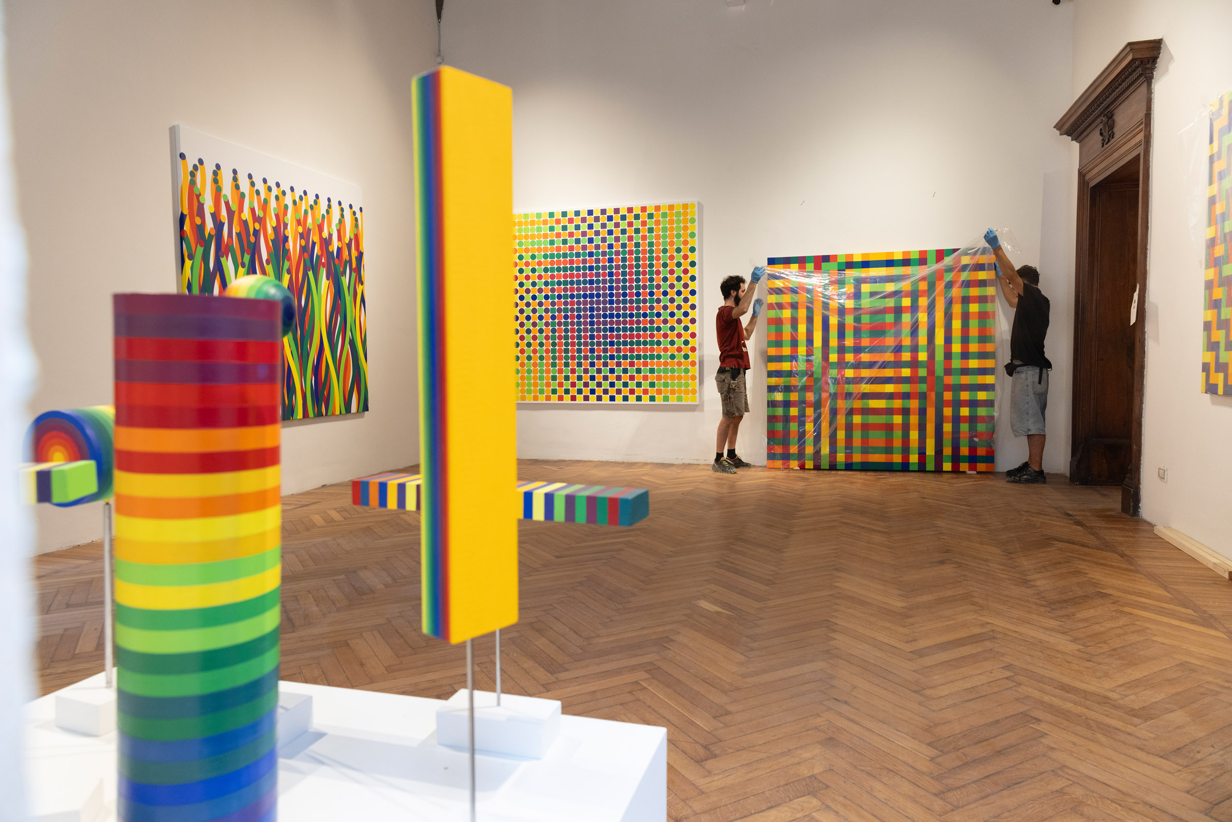 Il percorso espositivo è scandito da oltre 80 opere realizzate in oltre 60 anni di attività, dagli esordi, tra Parigi e Buenos Aires in Argentina, fino a lavori recenti e nuovi. Un fitto dialogo tra i colori, le luci e i movimenti dell’arte contemporanea e gli antichi affreschi dei soffitti del Palazzo monumentale.