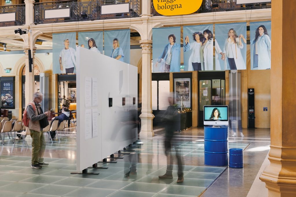 La mostra Sorelle d’Italia. Il lusso di resistere è costituita da un’imponente serie fotografica che ritrae donne dai volti fieri e combattivi, composta da dodici quadri sequenza su tessuto poliestere trasparente visibile su entrambi i lati, ispiratasi al logo dell’associazione, che vede bamboline tenersi per mano e, anche nelle dimensioni, all’ affresco corale seicentesco del bolognese Guido Reni L’Aurora, ultima opera realizzata a Roma prima di rientrare definitivamente a Bologna. L’iconografia di questi lavori anticamente veniva commissionata in palazzi privati come buon auspicio per la rinascita delle famiglie nobili. Nel nostro caso il luogo dove viene proposta l’opera è pubblico, la biblioteca Salaborsa, cuore attivo della città, di buon auspicio per la rinascita dello stabilimento e della tutela del lavoro.