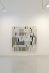 Ci sembra che questa impressione trovi in qualche modo conferma nelle parole dell’artista stesso: «ricordo che mio padre ridipingeva il nostro recinto di anno in anno, di solito con lo stesso colore. Questo atto che sembrava di routine e poco importante in verità era miracoloso nel modo in cui la superficie veniva sigillata, sostituita da ciò che sembrava essere una lavagna pulita, ma ad un esame più attento quella storia era evidente in modi sottili come un sottostante ricordo d’uso» (Steve Riedell, aprile 2021). Ecco allora che gli assemblaggi di schegge (segmenti, tavole, listelli) di legno rivelano una loro storicità che si compie nel tempo, nei giorni, negli anni. Suona lievemente bizzarra la scelta dell’artista di definire le sue opere dipinti, laddove la superficie pittorica appare invece punto di partenza di volta in volta rinegoziato, negato, stravolto. E tuttavia l’atto del dipingere, dello stendere il colore sulla tela, poi rifinirlo con una spatola o con uno strato di trementina, e successivamente incollare la tela su un ripiano di legno o tenderla su un telaio, per poi smontare, ritagliare, ripiegare, ristendere, restituisce chiaramente l’immagine del palinsesto, del sovrapporsi di un’azione dopo l’altra, sempre uguale eppure diversa ogni volta.