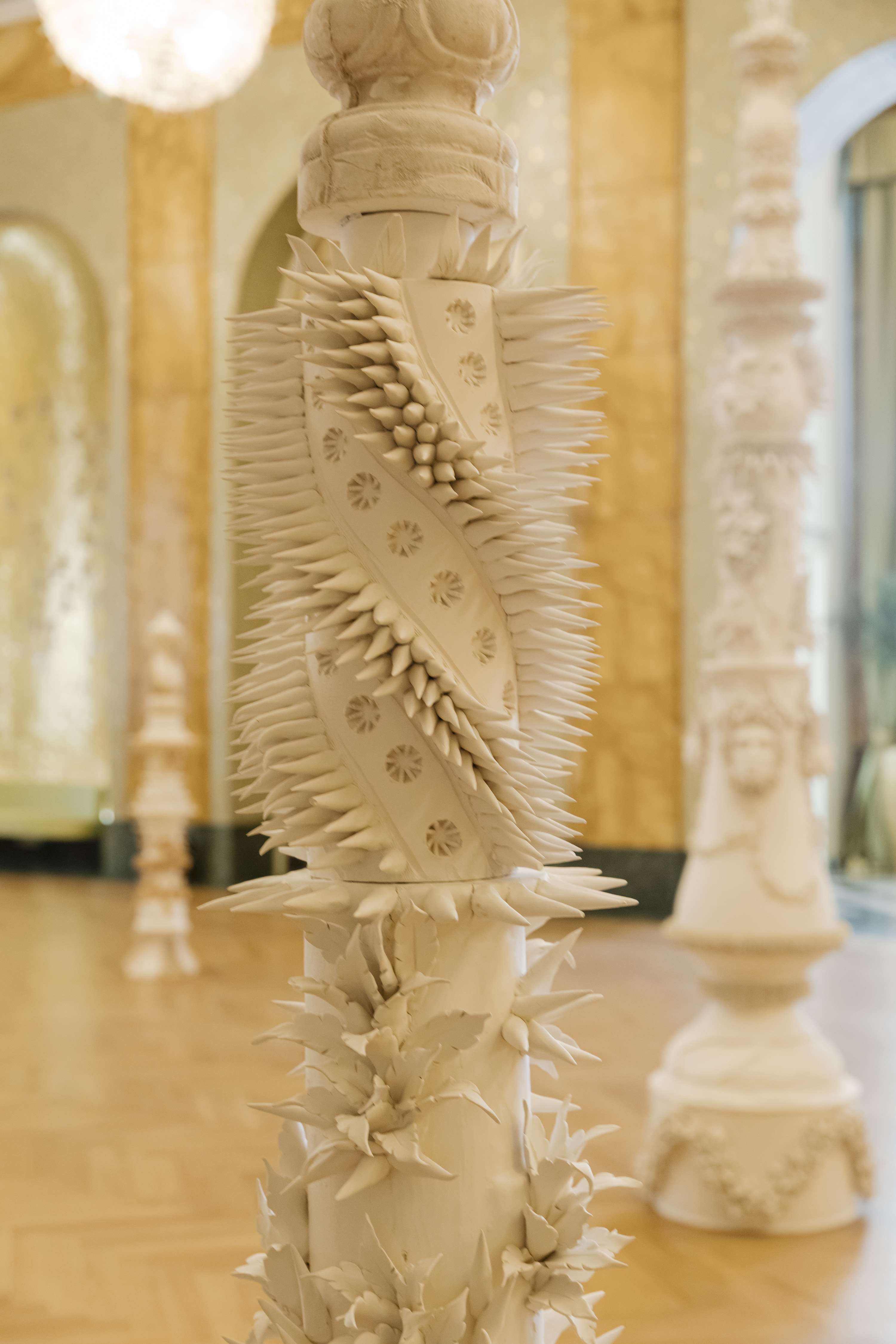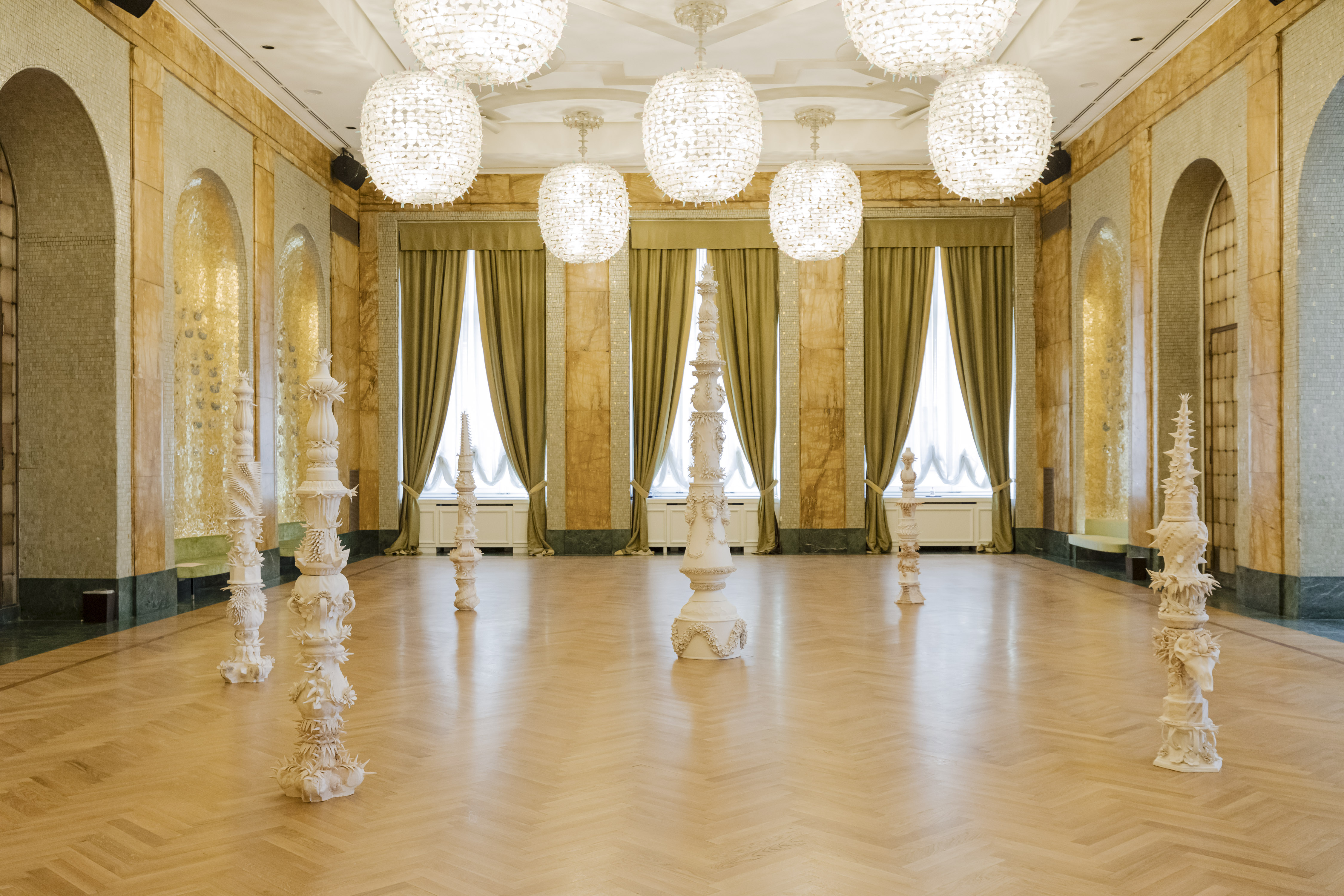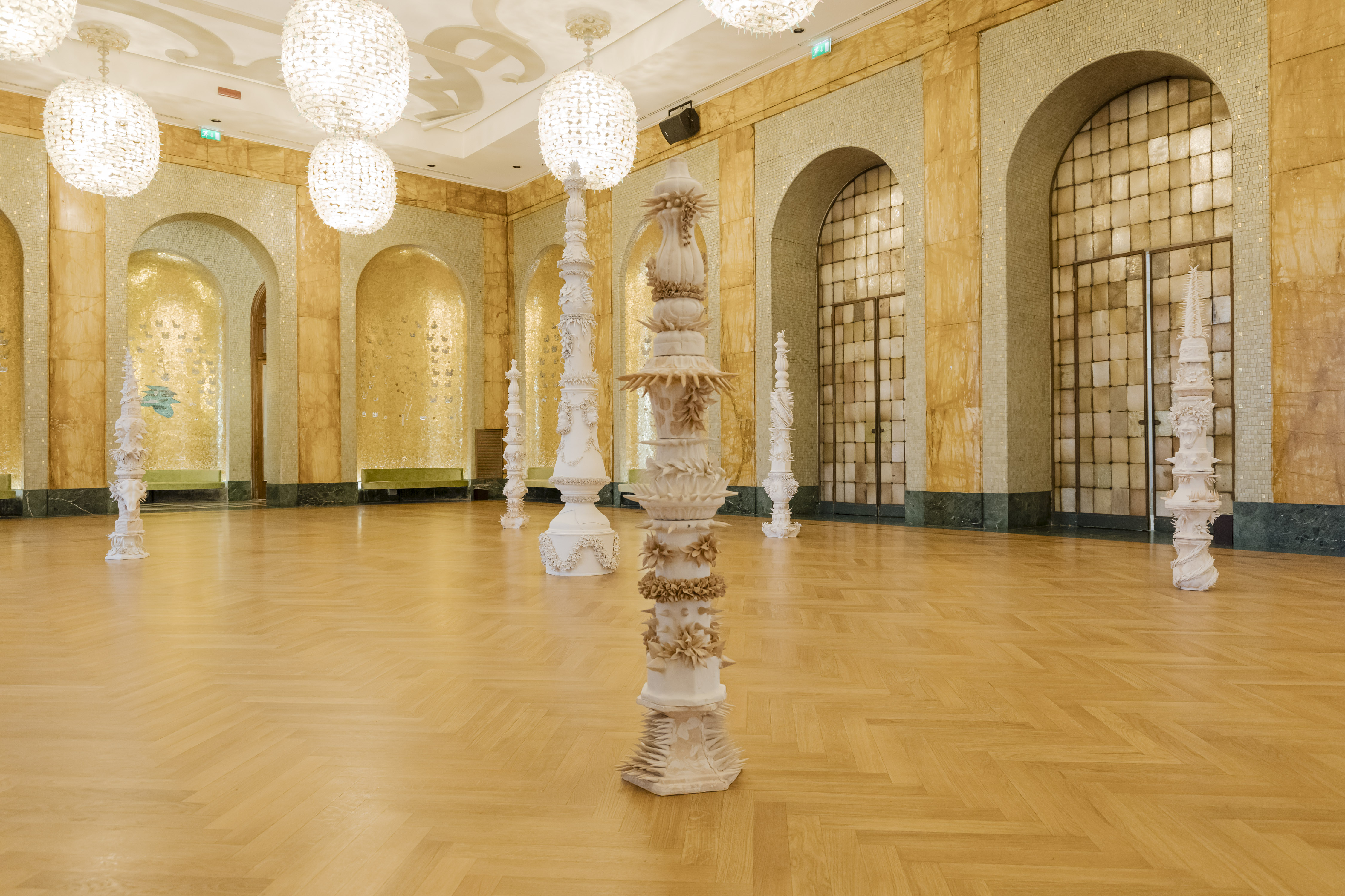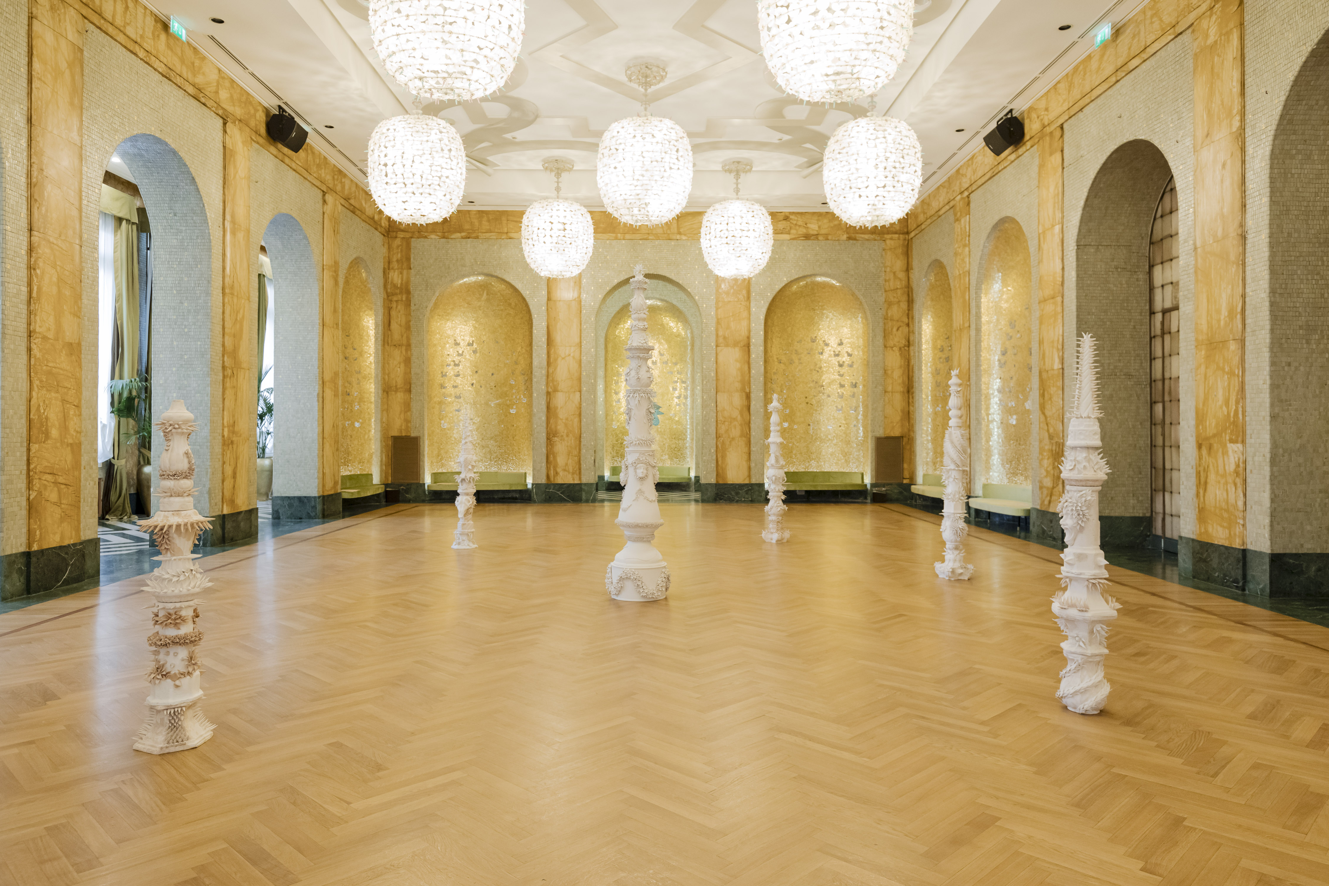 Una location storica, quella del Salone delle Feste dell’Hotel Principi di Piemonte, fa da cornice alle opere di Diego Cibelli, Obelischi e Totem popolano gli spazi e propongono una sintesi dei valori fondamentali del suo creare. Il progetto espositivo curato dall’artista e dalla Galleria Alfonso Artiaco di Napoli, in collaborazione con Artissima e UNA Esperienze, si presenta come un progetto emblematico nella ricerca dell’artista. Materiali, storia, tecniche, tutto viene collegato con un gioco sapiente di rimandi, dove passato, presente e futuro convivono insieme.