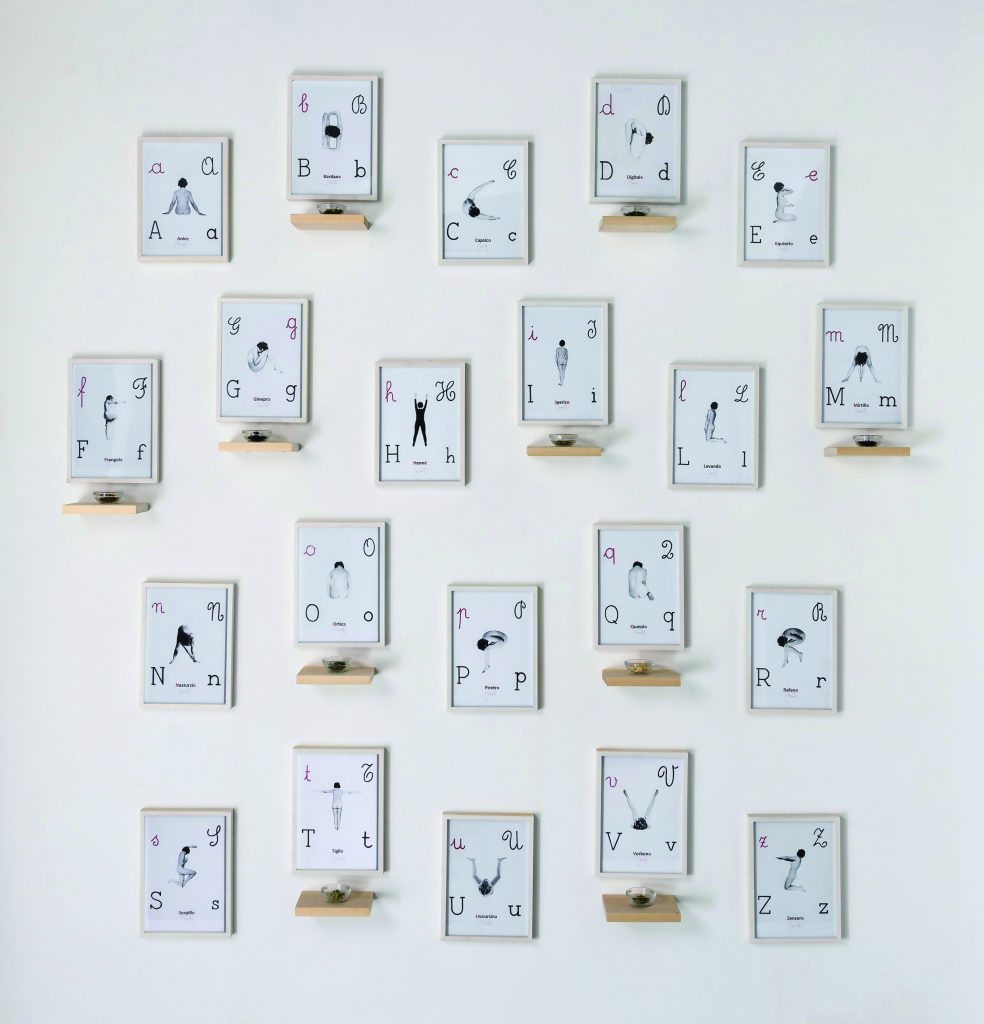 La scrittura visuale di Binga si declina in scrittura corporea nei suoi iconici alfabeti. Se negli storici collage di Alfabeto Pop (1977) lettera e corpo si abbracciano nella forma, nell’Alfabeto officinale il corpo stesso si fa lettera. In questa serie, esposta nella sua interezza nella mostra alla galleria Erica Ravenna, l’alfabeto di Binga si arricchisce di un significato naturalistico. Ortica, Lavanda, Verbena, Zenzero: il corpo dell’artista annuncia qui le iniziali dei nomi di piante officinali.