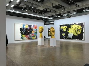 Come prolungamento della sedia, la svastica si impone con il suo colore rosso ma anche come simbolo di potere e di pace, come lo intendevano le numerose culture ancestrali. Il simbolo è stato poi strumentalizzato dal regime nazista dopo averlo ruotatun contesto astratto. A metà percorso si trovano una serie di dipinti (sempre in formato monumentale) dedicati a Edvard Munch. Si tratta di una reinterpretazione dei dipinti Autoportrait en enfer e Le Noctambule dei primi anni del Novecento del pittore norvegese. I volti macrabi, i violenti rossi di Baselitz sono ancora più spaventosi per via delle pareti che passano dalla tonalità bianca al grigio scuro. La penultima sala lascia senza fiato: al centro delle teste in legno dipinto di giallo circondate da grandi tele degli anni 80 e 90. Troviamo una donna viola nell’opera Bildneunundzwanzig del 1994, i cerchi neri e le chiazze colorate del Bildacht del 1991 e il Die Madchen von Olmo II del 1981, dove due ragazze in bicicletta viste dall’artista in Italia diventano delle silhouettes. Come non ricordarsi le figure femminili ritratte dal gruppo Die Brücke ?