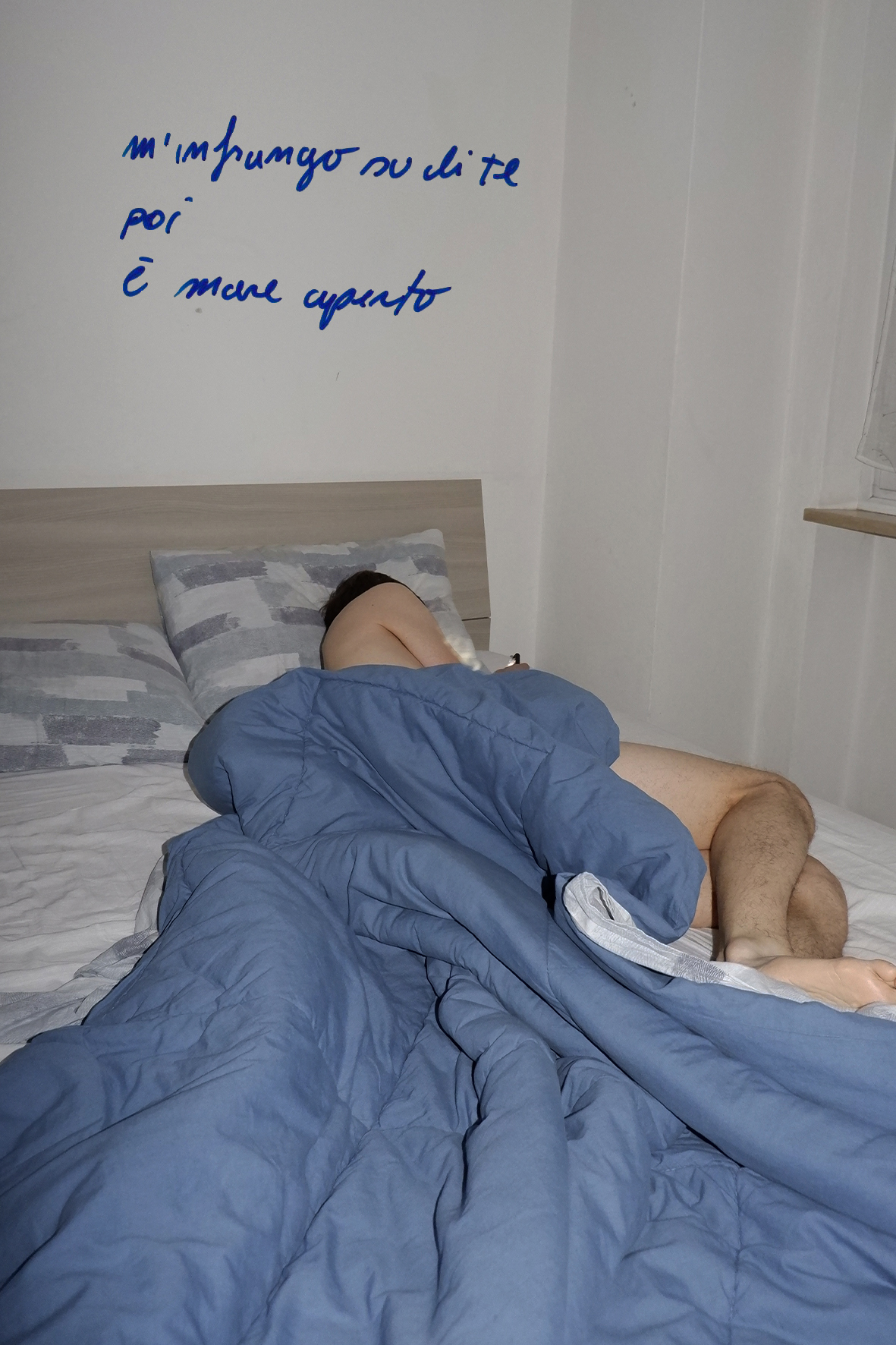 «Acque calde è anche il titolo di un’opera esposta, che vedo nel complesso come un punto nodale per tutto il concept, come se da essa si sviluppassero e avviluppassero le altre. Infatti, nell’immagine si presentano due piedi freddi, ghiacciati, sopra coperte che invece ardono. Il lavoro vuole immortalare poeticamente quel momento di estrema intimità e tenerezza in cui, all’inizio di un rapporto sessuale, le estremità inferiori del corpo del partner risultano gelate. Si crea un cortocircuito tra il fervore del momento, che tende all’unione dei corpi e quindi al calore, e quel piccolo istante di freddo distacco. Questo lavoro assieme alle altre opere in mostra cerca di esplorare gli aspetti più intimi dell’amore, ponendo l’accento sulle zone di imbarazzo e sulle contraddizioni. Il titolo l’ho proposto in inglese perché il fonema a mio avviso rende meglio una sensazione di grande accoglienza, inglobamento e calore appunto. In più, sempre riferendomi a ciò che il fonema mi trasmette, non provo una sensazione del tutto piacevole, e infatti la mostra è così, oscilla tra dolcezza poetica e punti scomodi. Il minuscolo per evitare un’eleganza che, in questo caso, mi sembrava forzata».