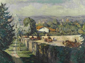 Tra gli artisti in viaggio in Italia interessanti Philipp Klein, l’unico autodidatta del gruppo en plein air, con il fresco e luminoso Sulla spiaggia di Viareggio (1906) e Georg Greve-Lindau vincitore di un premio a Firenze con l’intima Veduta della via Senese dal giardino di Villa Romana vicino a Firenze (1912-13) tra campagna e città.