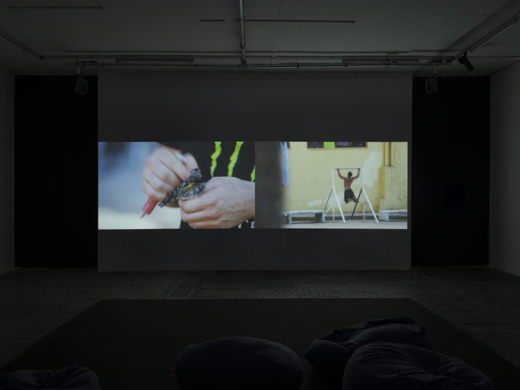 In concomitanza si svolge la personale, curata da Andrea Bellini, del filmmaker Menelaos Karamaghiolis, figura di primissimo piano della scena filmica ed artistica greca a partire dagli anni ‘80, attento a figure marginali definite degli anti-eroiche. Si ricorda qui il documentario ROM, nel 1989, all’inizio non apprezzato, ora considerato invece pietra miliare della filmografia documentaristica greca, un “capolavoro che deve diventare un classico della storia del cinema”; BLACK OUT (p.s. RED OUT) nel 1998, un film horror-erotico, primo film postmoderno greco, mentre J.A.C.E. – Just Another Confused Elephant 2012, presentato a 52 festival. È la storia di un bambino albanese a cui viene uccisa la famiglia, che si rifugia in Grecia e vive per strada, il regista documenta la sua vita per quattro decenni costruendo parallelamente un affresco della storia della Grecia. Apre la mostra il film A bird in search of a cage, 2019 con due proiezioni, dove si narra con studiata lentezza e poesia la storia di un adolescente detenuto greco, che non ha voluto parlare per non mettere in pericolo la propria famiglia e che si proclama innocente. Il ragazzo, detenuto per una mezza dozzina di anni, fa amicizia con un cardellino che nutre e cura e che ritorna sempre nella gabbia nella cella del ragazzo. I temi sono la libertà, la cura, le problematiche della vita narrati con una storia struggente. Segue la videoinstallazione City Divers del 2022, girato con il cellulare e proiettato in formati analogici e digitali: si tratta di ragazzi che si tuffano in una fontana durante una notte d’estate. Il regista cattura questo particolare momento veritiero trasfigurandolo, attraverso il gioco delle ombre profonde e la luce zigzante e un rallentamento che si rifà al “paradosso cinetico” narrato da Oliver Sacks secondo cui la lentezza paradossale dei gesti dei malati di Parkinsons produce un effetto di stasi. Il risultato è estremamente poetico e quasi mistico.