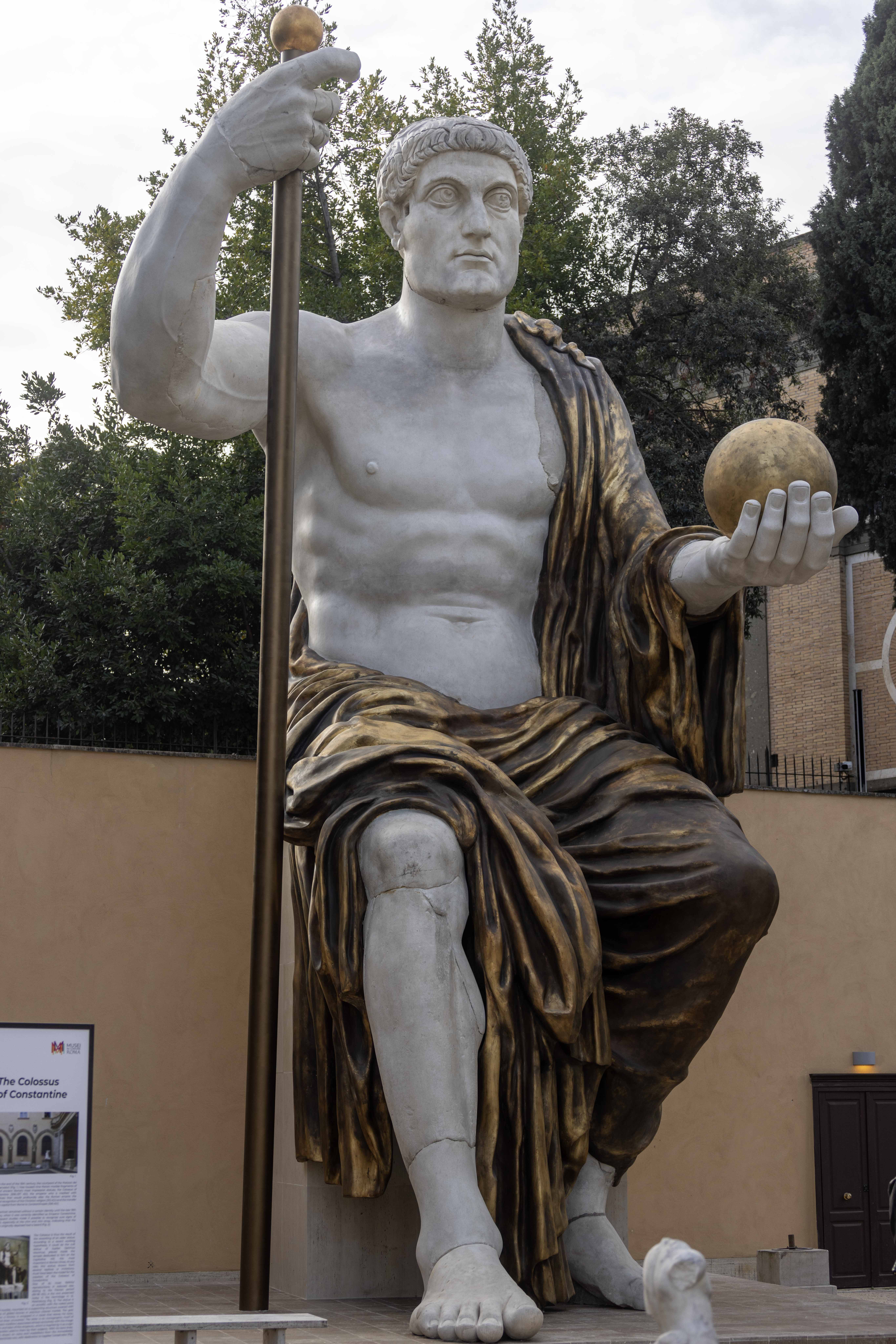 Testa, braccio e mano destra, polso, ginocchio e stinco destri, piede destro e piede sinistro. Sono i pochi frammenti pervenuti della colossale statua di Costantino I, opera composita in marmo e bronzo dorato, databile tra il 313 e il 324, considerata tra le realizzazioni più notevoli della scultura romana tardo-antica, alta 12 metri. Ed è grazie a questi pochi ma suggestivi frammenti, conservati nel cortile di Palazzo dei Conservatori ai Musei Capitolini, che è stato possibile ricostruire la statua nella sua imponente interezza, al termine di un lavoro di analisi archeologica, storica e funzionale dei pezzi, supportata dalla lettura delle fonti letterarie ed epigrafiche. E così, da oggi, la Statua colossale di Costantino I può essere ammirata nel giardino di Villa Caffarelli.