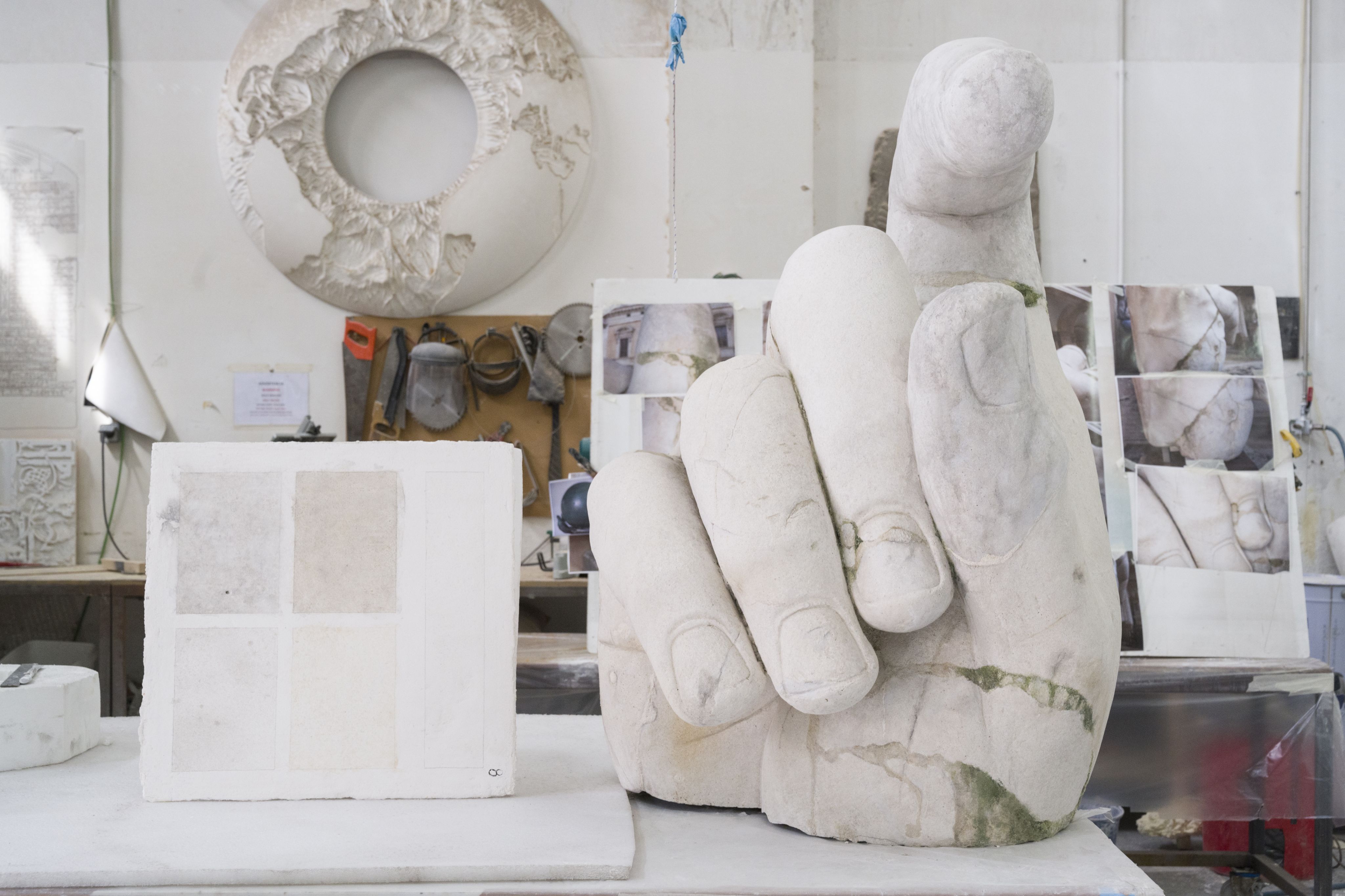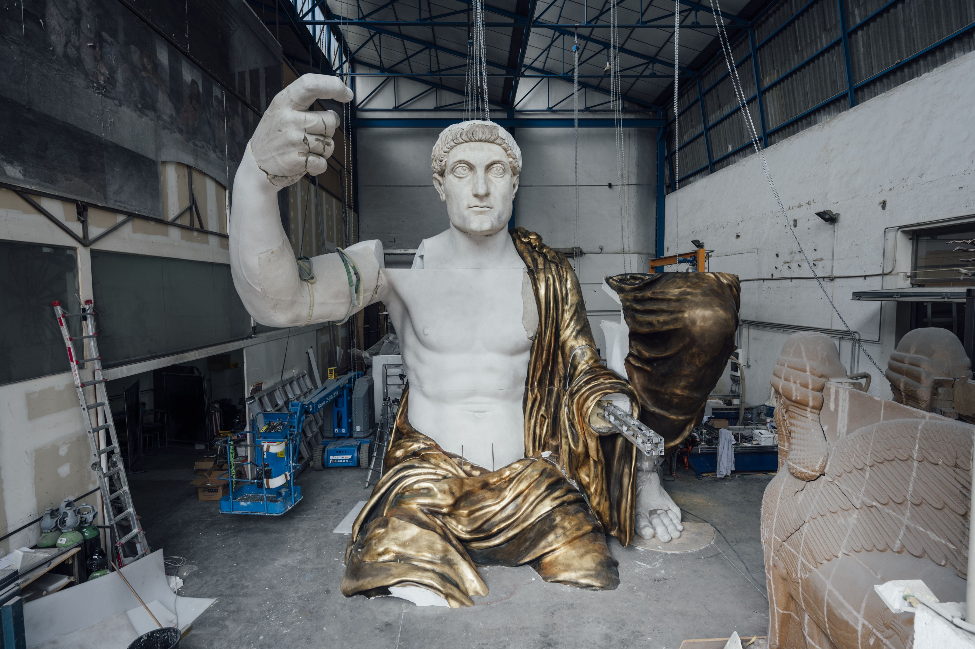 Dopo aver ultimato il modello 3D ad altissima risoluzione, si è poi proceduto con la ricostruzione materiale del Colosso. Resina e poliuretano, insieme a polvere di marmo, foglia d’oro e gesso, sono stati scelti come materiali per rendere le superfici materiche del marmo e del bronzo, mentre per la struttura interna – originariamente forse composta di mattoni, legno e barre di metallo – è stato impiegato un supporto in alluminio facilmente assemblabile e rimovibile.