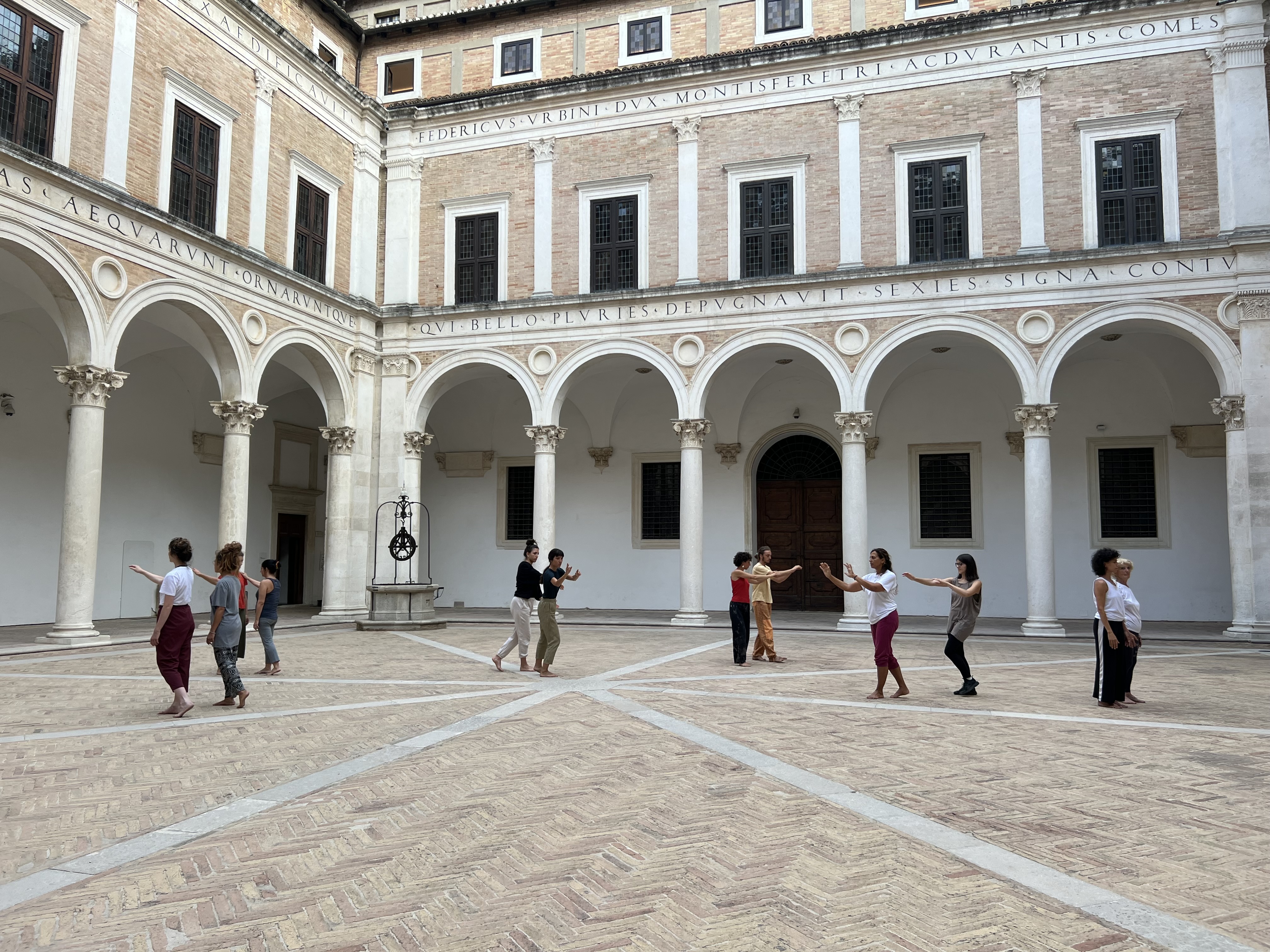 Siamo a Urbino, negli spazi della Galleria Nazionale delle Marche/Palazzo Ducale. Qui Virgilio Sieni ha ideato “Il silenzio vicino”, performance site-specific – che rientra nel progetto Territori del gesto 2022 – pensata come rito collettivo per abitare uno spazio architettonico richiamando il senso poetico e umanistico che la storia e l’arte custodiscono nel luogo. Accanto all’attività di coreografo per la sua compagnia, Sieni da anni conduce una serie di pratiche rivolte a danzatori non professionisti, eventi con cittadini comuni coinvolti in un ciclo coreografico di “danza sociale” o “di comunità”, attivato in luoghi aperti e musei.