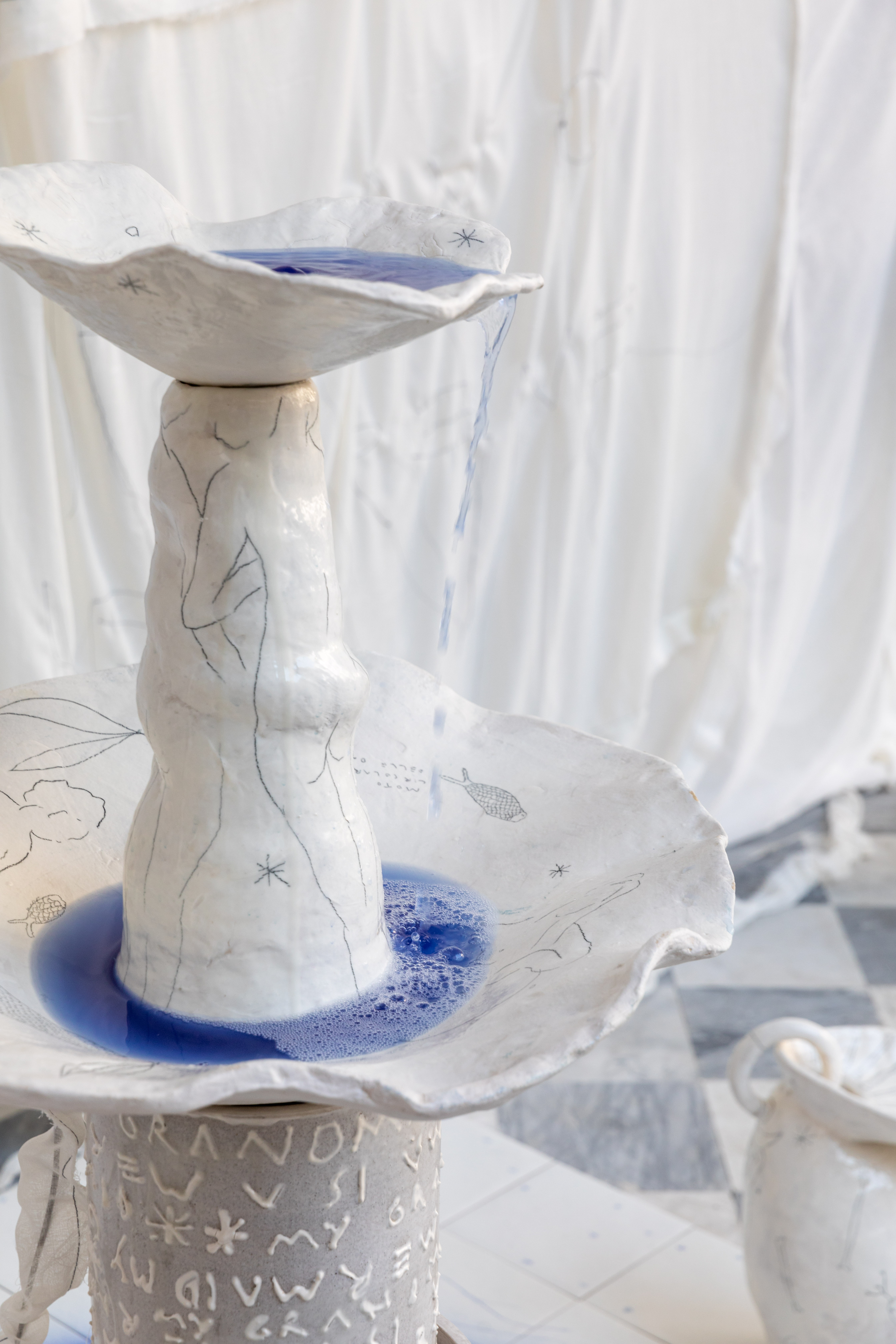 La Sezione Clearing of Objects è curata dal landscape architect Bas Smets e dall’Artist director Eliane Le Roux. Al centro troviamo una piccola fontana creata da Ccontinua + MAMT. Monsters Shed Tears of Pearls omaggia la figura della sirena come creatura ibrida, inno a ciò che è dentro di noi, una miscela dei caratteri femminile e maschile, del selvatico e del rigore. La fontana di ceramica è composta da una collezione di cilindri fatti con il tornio e la parte superiore fruttosi un lavoro più manuale. MAMT è tatuatore e visual artist qundi “tatua la ceramica” creando lo stesso effetto che si ottiene sulla pelle, il disegno è infatti eseguito sotto la cristallina.