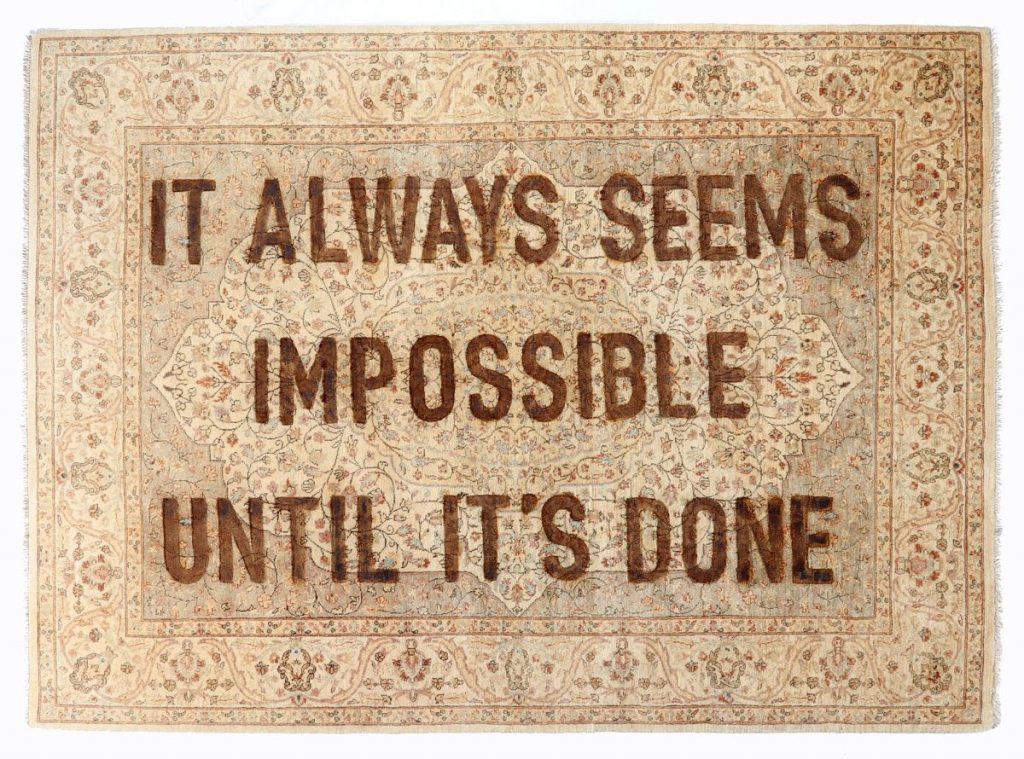 Loredana Longo ha inaugurato il primo intervento di arte contemporanea allo store di Sahrai Milano, a Mayfair. In occasione di “Second Life”, progetto espositivo a cura di Marina Dacci, l’artista nata a Catania nel 1967 ha dato una vita alternativa a una selezione di tappeti dell’area mediorientale, imprimendo e scavando con il fuoco, sulla superficie intessuta, alcune frasi pronunciate da politici occidentali. Su questo spazio espressivo rifunzionalizzato, si animano così dichiarazioni di sapore libertario, che hanno segnato la nostra cultura in ambito politico e sociale e si sono radicate nell’immaginario popolare.