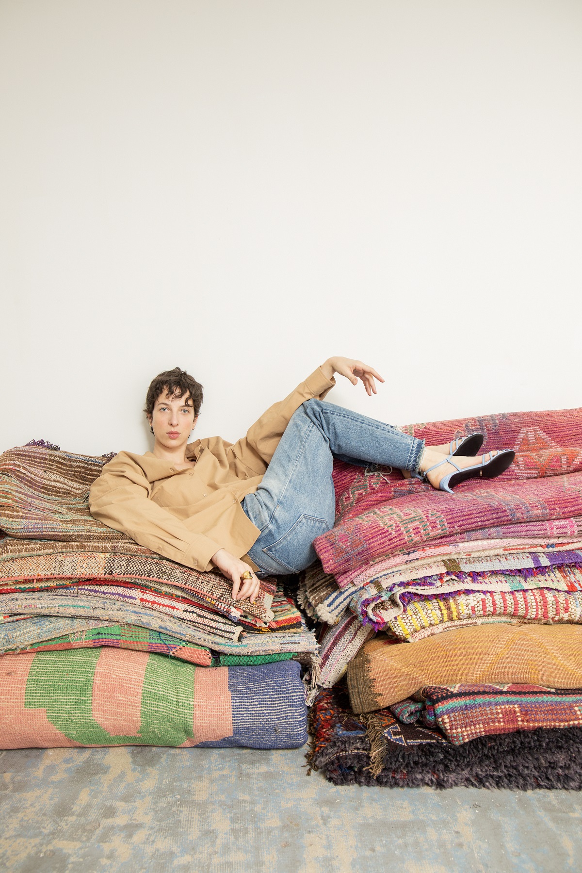 In altri casi, oltre al gioco di forme e materiali timeless, è l’accostamento per texture come nel look in cui una serie di tappeti di Paris Berbere, costruiti tramite recupero di tessuti vintage e sostenibili è stato accostato a un completo giacca e pantaloni di Dries Van Noten. Da questa idea è nato un vero dialogo tra forme e colori, giochi di superfici, reso possibile anche grazie allo spazio Galerie 20.80 di Parigi, galleria specializzata in oggetti di design e decorazione dal XX secolo. La scelta della stessa modella Camille (selezionata tramite uno street casting) vuole incarnare l’idea di una donna reale e contemporanea, che vive e dialoga con gli spazi in modo naturale, senza indulgere troppo in pose moda classiche.
