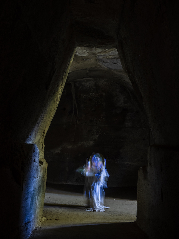 Nelle fotografie presentate nella Sacrestia del Vasari è ritratta la stessa artista, le immagini sono dinamiche, passano continuamente dalla materia all’astrazione, chiudendosi in rapidi movimenti circolari, richiamando la perfezione geometrica del cerchio, la cosmologia aristotelica, cara a Dante, ma anche la sonorità della tammorra, che pervade gli antichi rituali di diverse comunità della Campania. Il titolo della mostra, Golfo mistico, non è scelto a caso, richiama il mondo musicale, vuol dire buco d’orchestra, è un omaggio proprio a quei luoghi attraverso i quali si ode ancora il suono di un passato ancestrale.