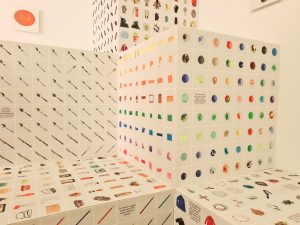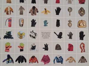 Attraverso tale rigida organizzazione dei suoi scatti, Barbara Iweins, con lapidarie considerazioni, ci pone di fronte a quelle ossessioni che, alla fin fine e con sfumature diverse, riguardano ognuno di noi. Costringendoci, allo stesso modo, a riflettere su come il consumismo incontrollato condizioni il nostro quotidiano nella sua totalità. Chi, infatti, non ha riposto in qualche cassetto, o nell’armadio, oggetti intonsi ancora sigillati nella loro confezione? Oggetti che ha usato una sola volta, oppure dimenticati di avere fin quando, inaspettatamente, ritrovati tra le mani? Nonostante lo spazio a disposizione per la mostra fosse veramente piccolo, una brillante soluzione ha ovviato a questo inconveniente logistico: le facciate di cubi, di diverse grandezze, che aumentano così la superficie utilizzabile, sono state ricoperte dalle piccole immagini di questi oggetti catalogati, suddivisi nelle diverse categorie predisposte dall’artista, accompagnate da brevissimi motti equivalenti ad asciutte e incontestabili sentenze, con percentuali che ancora di più offrono la misura dello stato delle cose.