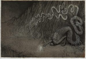 Trovo che Sandro Botticelli sia il più sopravvalutato fra gli interpreti: in lui non ho trovato carica innovativa ma piuttosto dei leitmotiv che si perpetuano per mezzo di uno stile Gotico ma che sbadigliano al Rinascimento. Ritengo affascinante la versione di Federico Zuccari, dove la purezza del disegno domina insieme con scelte espressive compositive innovative. Gustave Dorè, che oramai ha raggiunto il valore di archetipo cristallizzato nella memoria collettiva, l’abbiamo sin da subito volutamente eclissato: lo ritengo “ossessivo” e troppo “iconico” benché lo reputi un grande artista e nonostante abbia dato una tra le migliori interpretazioni della Commedia nell’Ottocento (non lo si può accusare, visto che furono gli anni Sessanta e Settanta del secolo scorso a divulgare massivamente le sue immagini, sdoganandole per tutti i generi, dalle enciclopedie alle edicole ai fascicoli). Ho preferito infine – e così anche la curatrice – attingere dai miniatori medievali e rinascimentali, e dai grandi cicli affrescati: ad esempio, la sublime armonia dei paradisi trasfigurati da Beato Angelico; oppure i magnifici inferni negli affreschi del Campo Santo a Pisa (gli stessi affreschi che ispirarono Michelangelo Buonarroti per il Giudizio Universale). Un artista sorprendente fu Amos Nattini, che nel panorama degli interpreti del Novecento è stato l’unico a emozionarmi davvero – più il suo Inferno e il suo Purgatorio e un po’ meno il suo Paradiso, che trovo troppo colorato e “carnale”, quindi non filologicamente aderente al testo dantesco. Mi piace sognare due illustrazioni della Divina Commedia “impossibili”, mai realizzate, a opera di Austin Osman Spare e di Duilio Cambellotti.