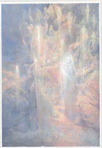 Non posso sbilanciarmi troppo; diciamo che in questa fase posso affermare che ho sicuramente concluso le tavole illustrative stabilite per la cantica dell’Inferno e che nelle prossime settimane tornerò “a riveder le stelle”. Mi sono già ripulito dalla caligine di quel nero carbone che mi ha accompagnato per tutta la prima cantica, nelle stesure di ombre e di grigi, di quella tenebra caliginosa descritta da Dante. Ho saputo declinare quel nero estratto dal carbone trasformandolo in un azzurro cinereo stemperato e disteso morbidamente in quell’aria nebulosa che avvolge il monte del Purgatorio. Ho già potuto realizzare alcune tavole del Purgatorio e del Paradiso, ma nei prossimi mesi mi dedicherò alle due cantiche con maggiore sistematicità.