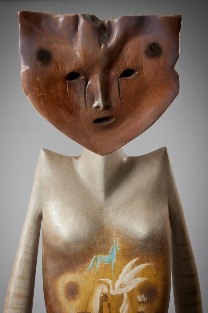 La Grande Dame, o Cat Woman. Ne aveva già vissute tante di vite Leonora Carrington, quando negli anni ‘50 modellava quella statua con l’amico artista José Horna: la storia con Max Ernst, la reclusione nel manicomio di Santander, Francia, Spagna, Lisbona, poi Città del Messico. E le racchiude tutte lì le sue storie, in quel ciocco di legno levigato che ha il volto di un gatto e le braccia aggraziate da ballerina. C’è tutto – e tutto un po’ confuso, come un sogno, tante immagini lussureggianti che affollano il petto della donna, quasi un erotico intento narrativo. C’è un uovo che fluttua, quel simbolo alchemico tanto caro a Carrington e alla sua amica e artista Remedios Varos (incarna il potere femminile di creare la vita, e insieme il potenziale di rinascita e rinnovamento). E c’è una dea simile a un lupo sulla schiena della Grande Dame, sta cullando uno spirito di tarassaco immersa tra la morbida lavanda. «Si tratta della scultura più significativa mai creata dall’artista», dicono gli esperti, un’opera ambiziosa e imponente che cattura l’essenza dell’esplorazione creativa di Carrington negli anni ’50. Ebbene, Sotheby’s ne annuncia la vendita il prossimo 18 novembre, a New York. La stima? $ 5-7 milioni.