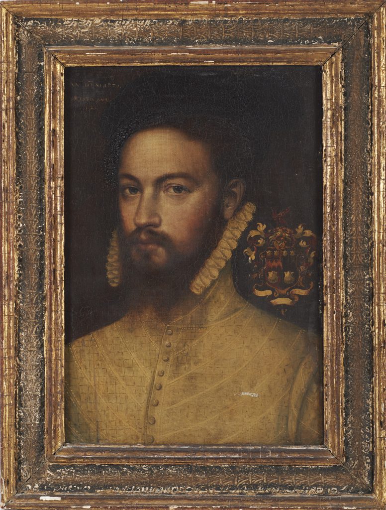 – Lotto 424, occhi puntati su un Ritratto virile ad opera di un Maestro del nord Europa del XVI secolo (stima € 18.000 – 20.000). E – inevitabile – sul suo scudo prezioso: «Le famiglie rappresentate», si legge sul catalogo, «sembrano appartenere a due nobili casate inglesi», più precisamente alla famiglia Dyve e agi Strickland. «Considerando l’epoca del dipinto riportata dal pittore (1570) insieme l’età dell’effigiato (aetatis suae 32), il personaggio ritratto potrebbe essere Lewis Dyve di Bedfordshire (morto nel 1592) sposato con Mary Strickland (figlia di Sir Walter Strickland) e nonno del più celebre Lewis Dyve (1599 – 1669) noto membro del parlamento inglese».