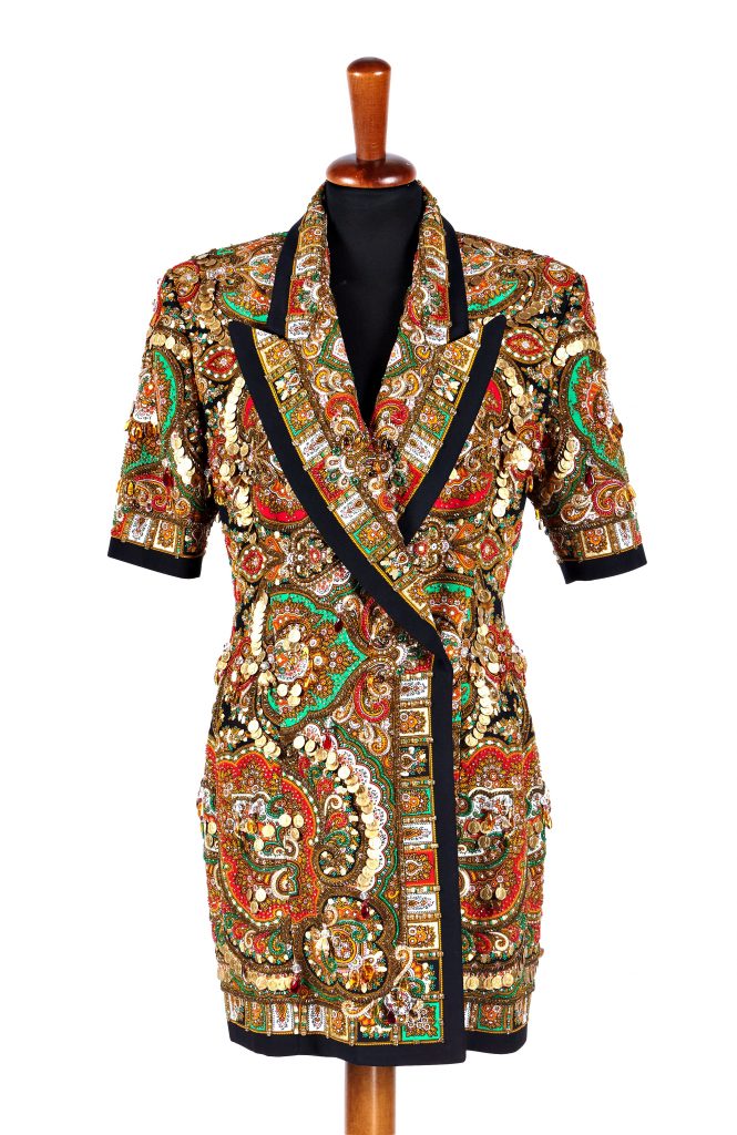 – Lotto 1018. Ultima grande protagonista della nostra rassegna, la giacca/mini abito interamente ricamata con perline e medagliette, presentata nel corso della sfilata Haute Couture dell’89. La firma: Gianfranco Ferrè. La stima: € 2.400 – 2.600.