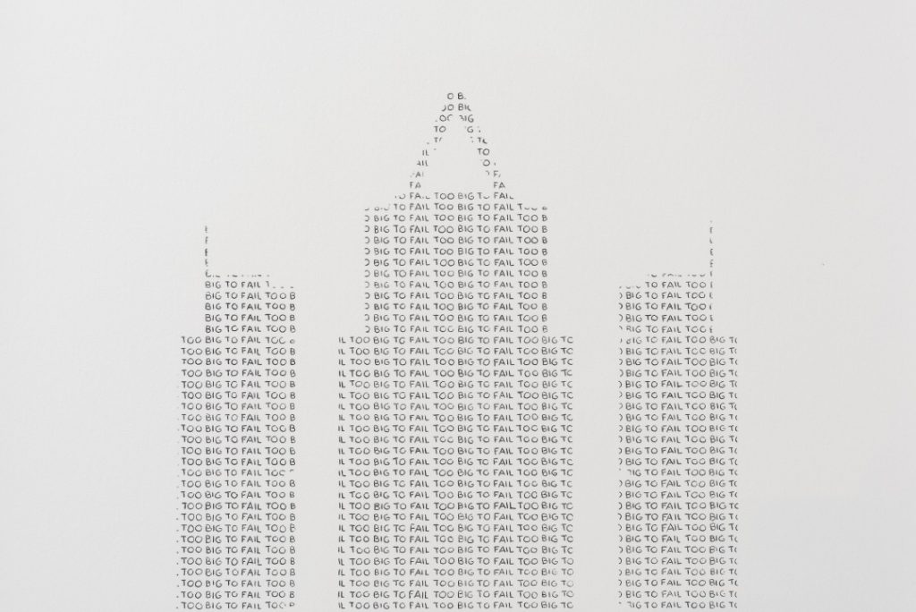 Ad uno sguardo più attento si nota che la figura viene tracciata dalla ripetizione ossessiva della scritta “too big to fail”, motto dell’economia neoliberista.